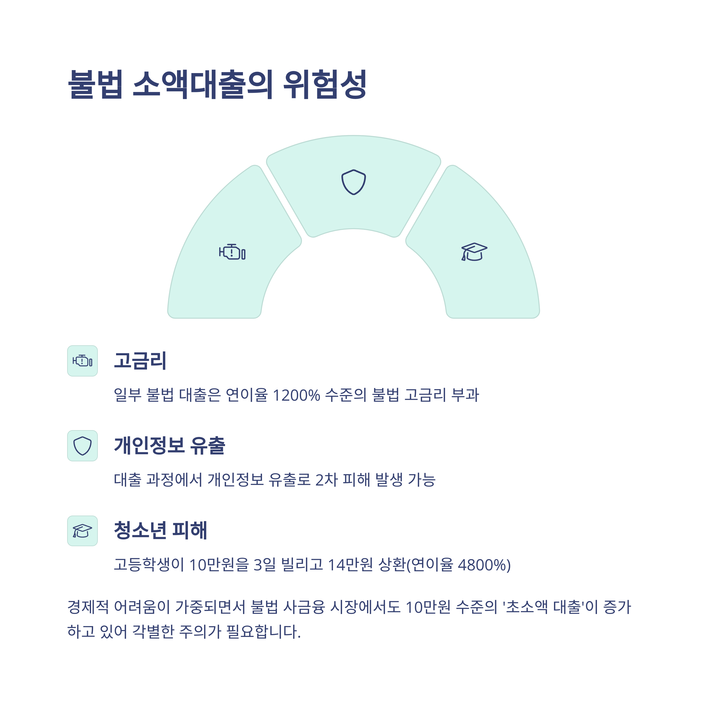 제가 진짜 강조하고 싶은 부분인데, 아무리 급해도 불법 사금융은 절대 절대 피해야 해요. 제가 아는 어떤 분은 10만원 빌렸다가 하루 이자가 몇 만원씩 붙어서 나중엔 걷잡을 수 없게 됐다는 얘기를 들었어요. 상상만 해도 아찔하죠? 심지어 개인정보까지 유출돼서 또 다른 피해로 이어지는 경우도 많다고 해요. 특히 청소년들이 이런 초소액 대출에 많이 넘어간다고 하니, 부모님들도 자녀들에게 이런 위험성을 꼭 알려주셔야 해요. 진짜, 아무리 힘들어도 합법적인 금융기관을 이용하는 게 답이에요. 불법 사금융은 겉으로는 쉽고 빠르게 돈을 빌려주는 것 같지만, 결국은 우리 삶을 더 피폐하게 만드는 지름길이라는 거, 명심해야 해요. 불법 사금융 피해 신고는 금융감독원 (국번 없이 1332)으로 연락하시면 됩니다. 아래는 불법 사금융의 주요 위험성이에요.