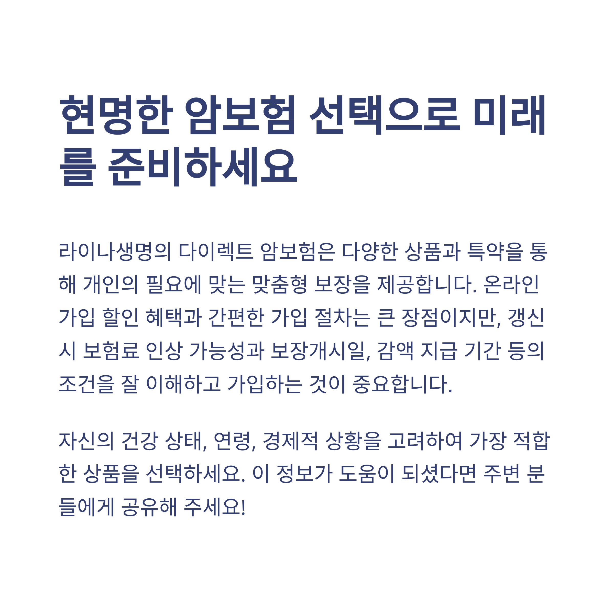 암보험, 아직도 어렵게만 느껴지시나요? 라이나생명 다이렉트 암보험으로 쉽고 현명하게 미래를 준비하세요!