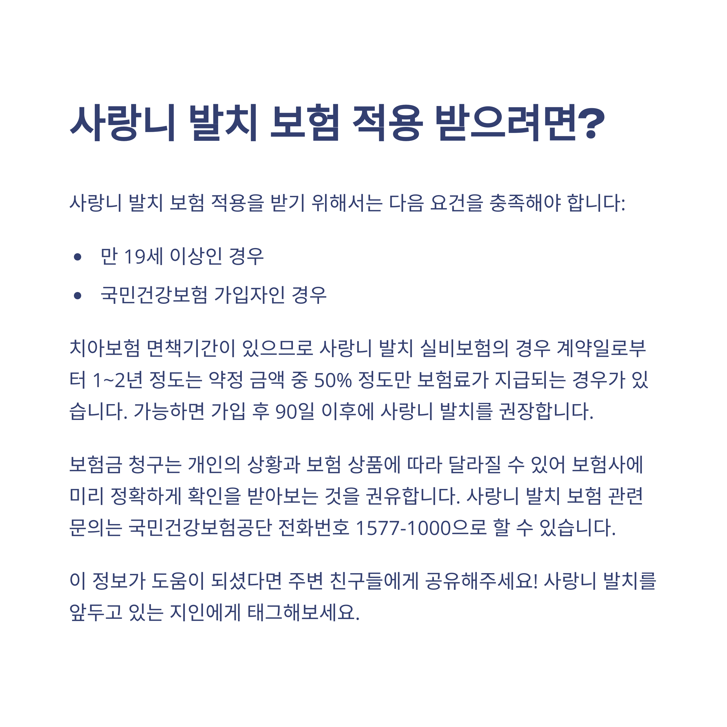 - 치아보험 면책기간 주의: 사랑니 발치 실비보험의 경우, 계약일로부터 1~2년 정도는 약정 금액의 50% 정도만 보험료가 지급될 수 있습니다. 가능하면 가입 후 90일 이후에 사랑니 발치를 권장합니다.