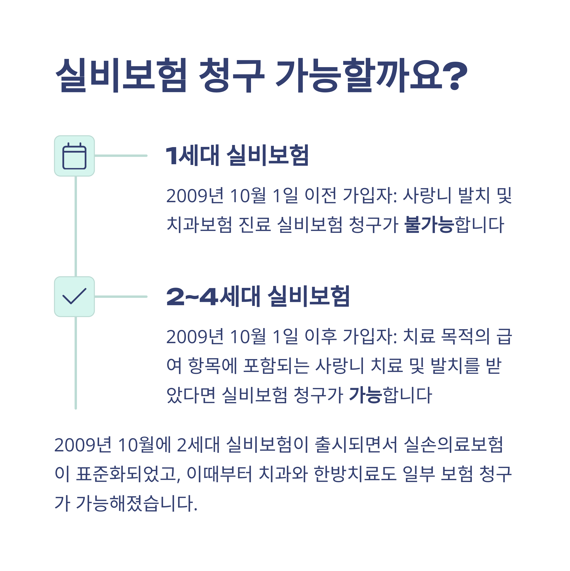 - 2~4세대 실비보험 (2009년 10월 1일 이후 가입자): 치료 목적의 급여 항목에 포함되는 사랑니 치료 및 발치를 받았다면 실비보험 청구가 가능합니다. 이때부터 치과와 한방치료도 일부 보험 청구가 가능해진 거죠.
