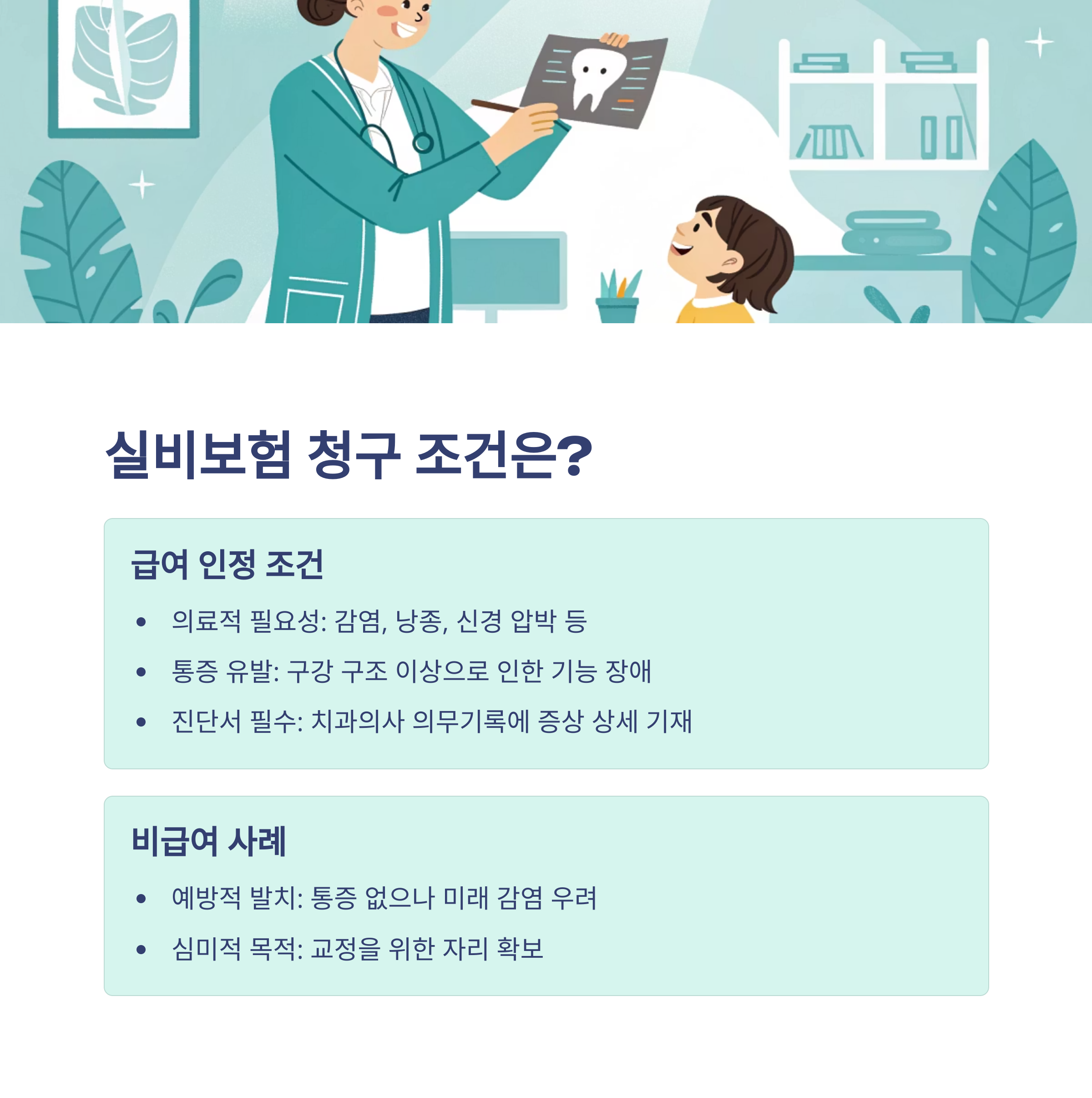 - 의료적 필요성: 감염, 낭종, 신경 압박 등으로 인한 발치여야 해요.