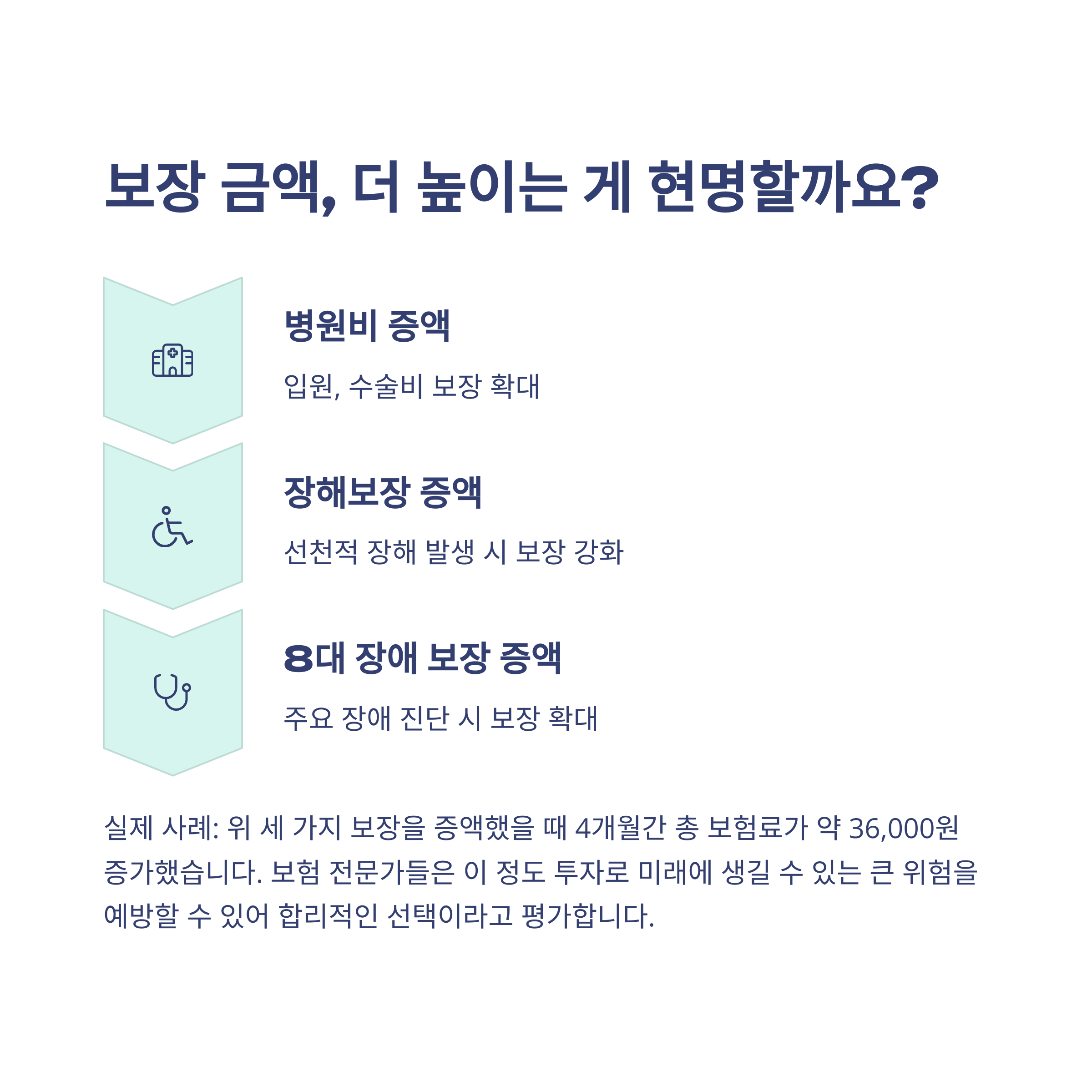 - 보장 금액 증액 고려: 전문가들은 장해 출생 담보와 8대 장애 진단 담보 모두 증액할 것을 권장합니다. 약 36,000원 정도의 추가 투자로 미래 위험에 더 크게 대비할 수 있습니다. 실제 가입 보장 금액 증액 사례를 참고해보세요.