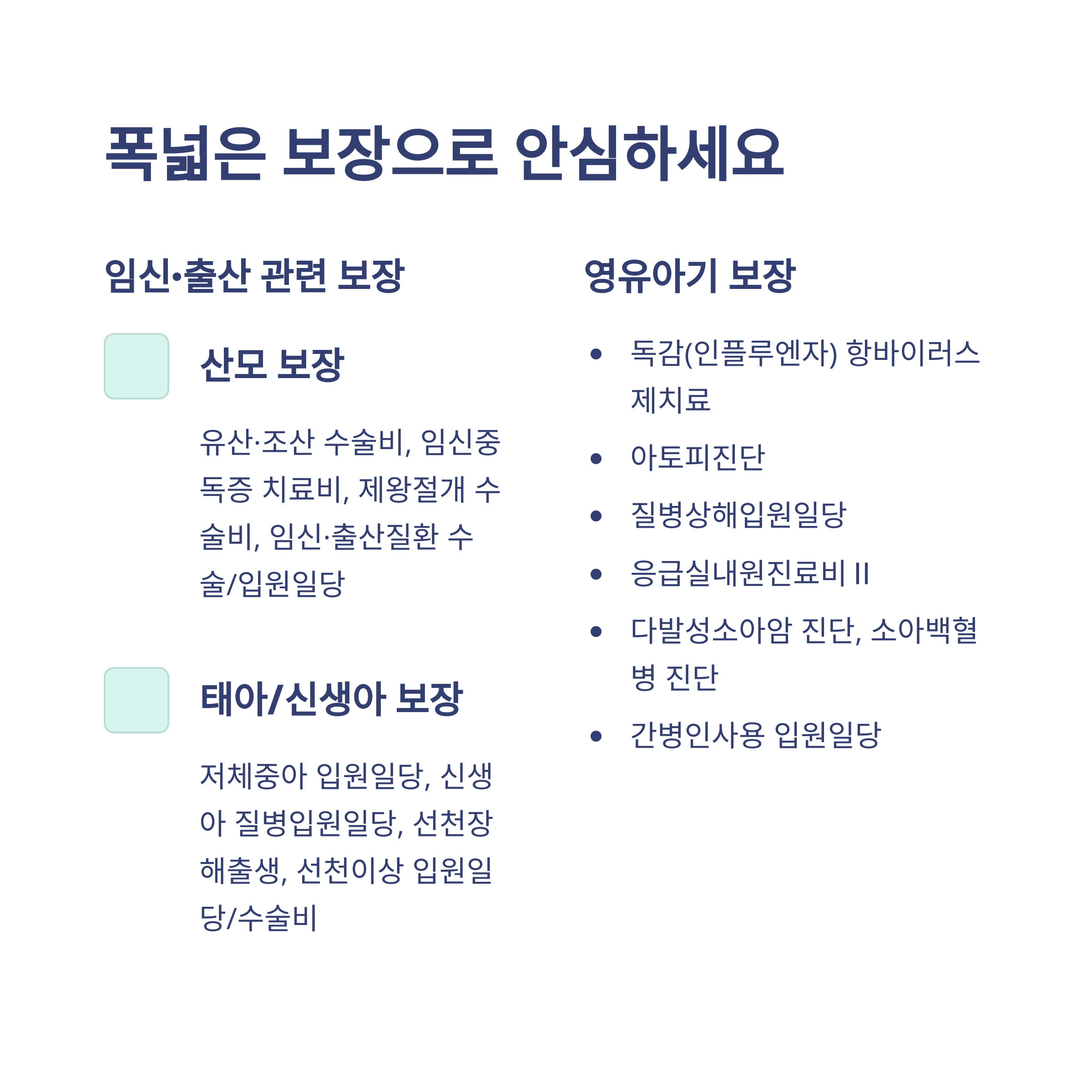 임신 중 산모(유산·조산, 임신중독증, 제왕절개 등)부터 태아(저체중아, 선천이상 등), 신생아, 그리고 출산 이후 어린이(독감, 아토피, 소아암 등)까지 폭넓게 보장합니다. 정말 든든하죠!