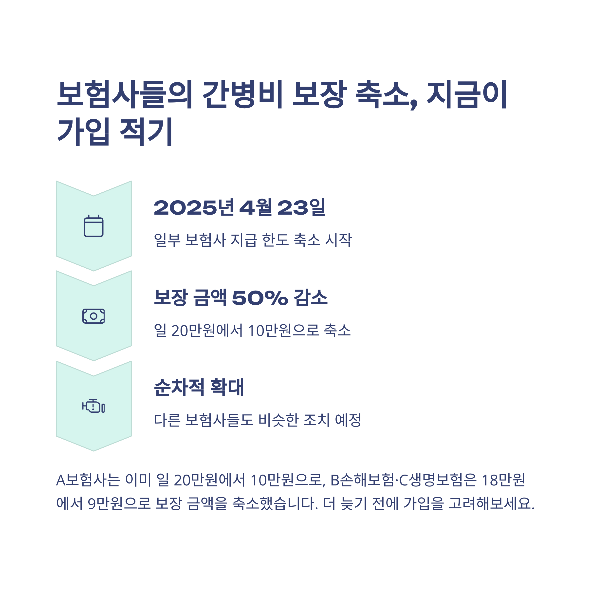 2025년 4월 23일부터 일부 보험사들은 간병비보험 지급 한도를 줄였어요. 예전에는 하루 20만원씩 보장하던 것을 이제는 10만원으로, 혹은 그보다 더 낮은 수준으로 줄이고 있죠. 이 변화는 곧 가입 타이밍이 중요해졌다는 걸 의미합니다.