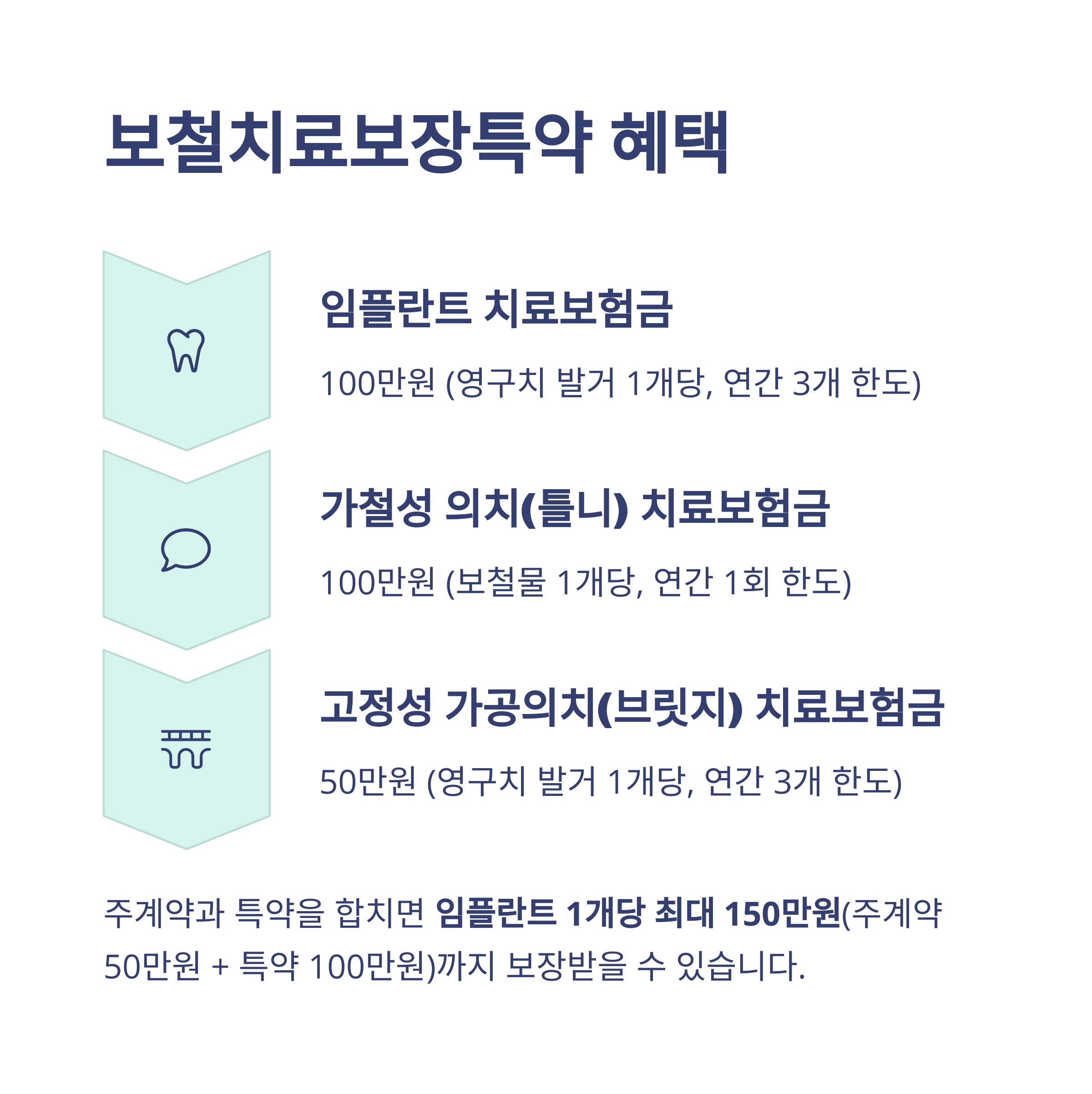 - 임플란트: 주계약 50만원 + 특약 100만원 = 총 150만원 보장 (연간 3개)