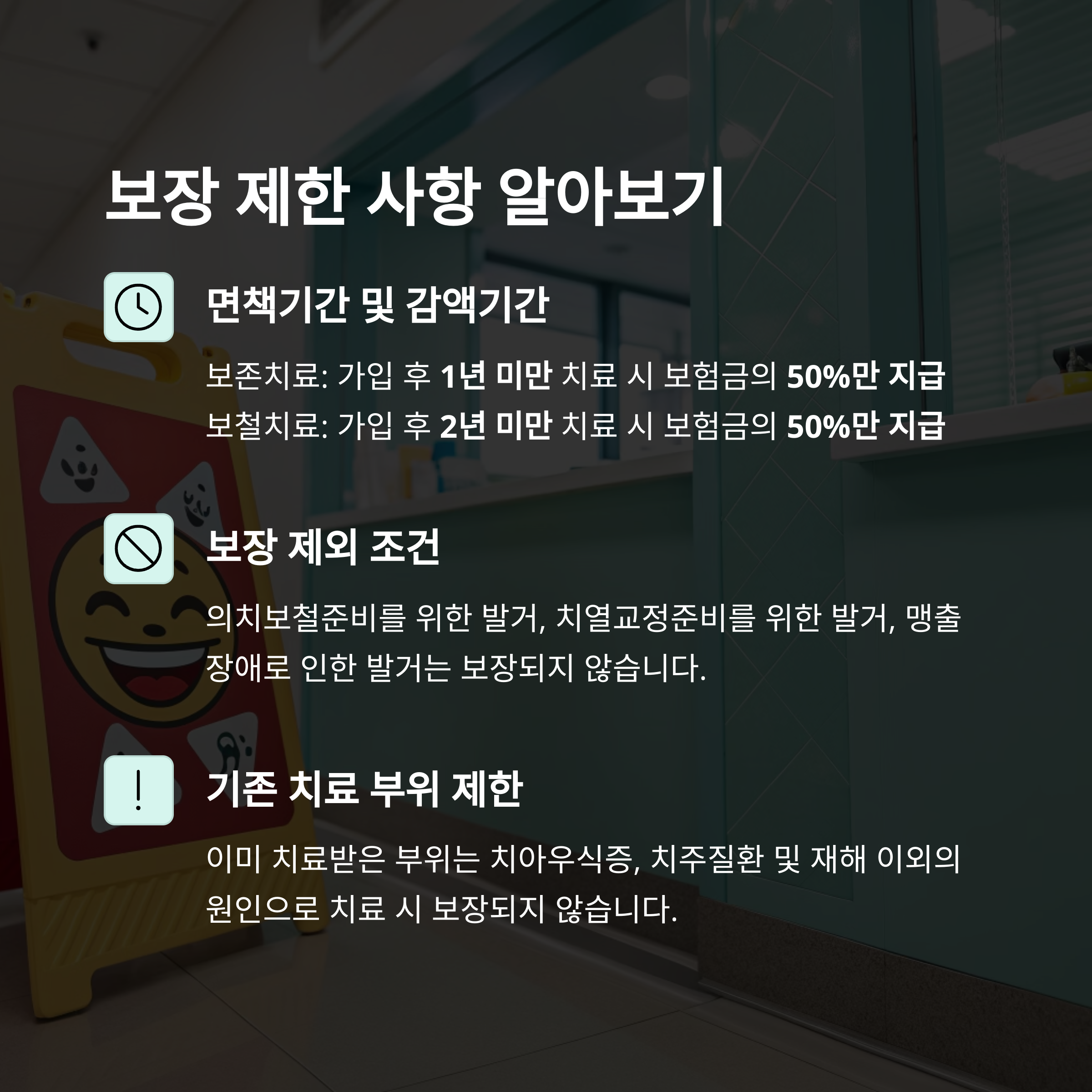 - 보존치료는 가입 후 1년 미만, 보철치료는 2년 미만 시 보험금 50%만 지급