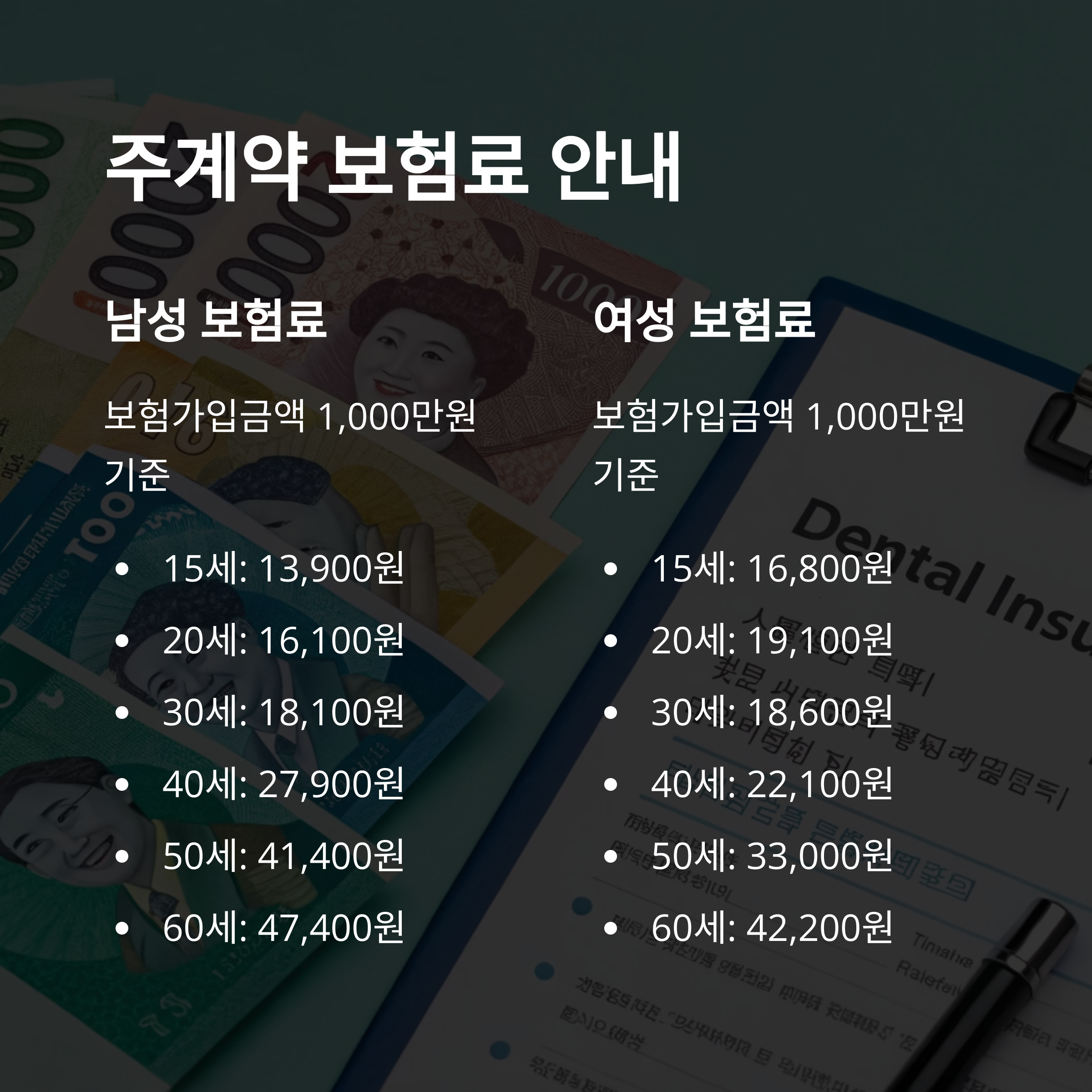우체국 치아보험은 연령대와 성별에 따라 보험료가 다르게 책정되며, 주계약 외에 특약을 추가할 경우 보장 범위와 보험료가 크게 확대됩니다.