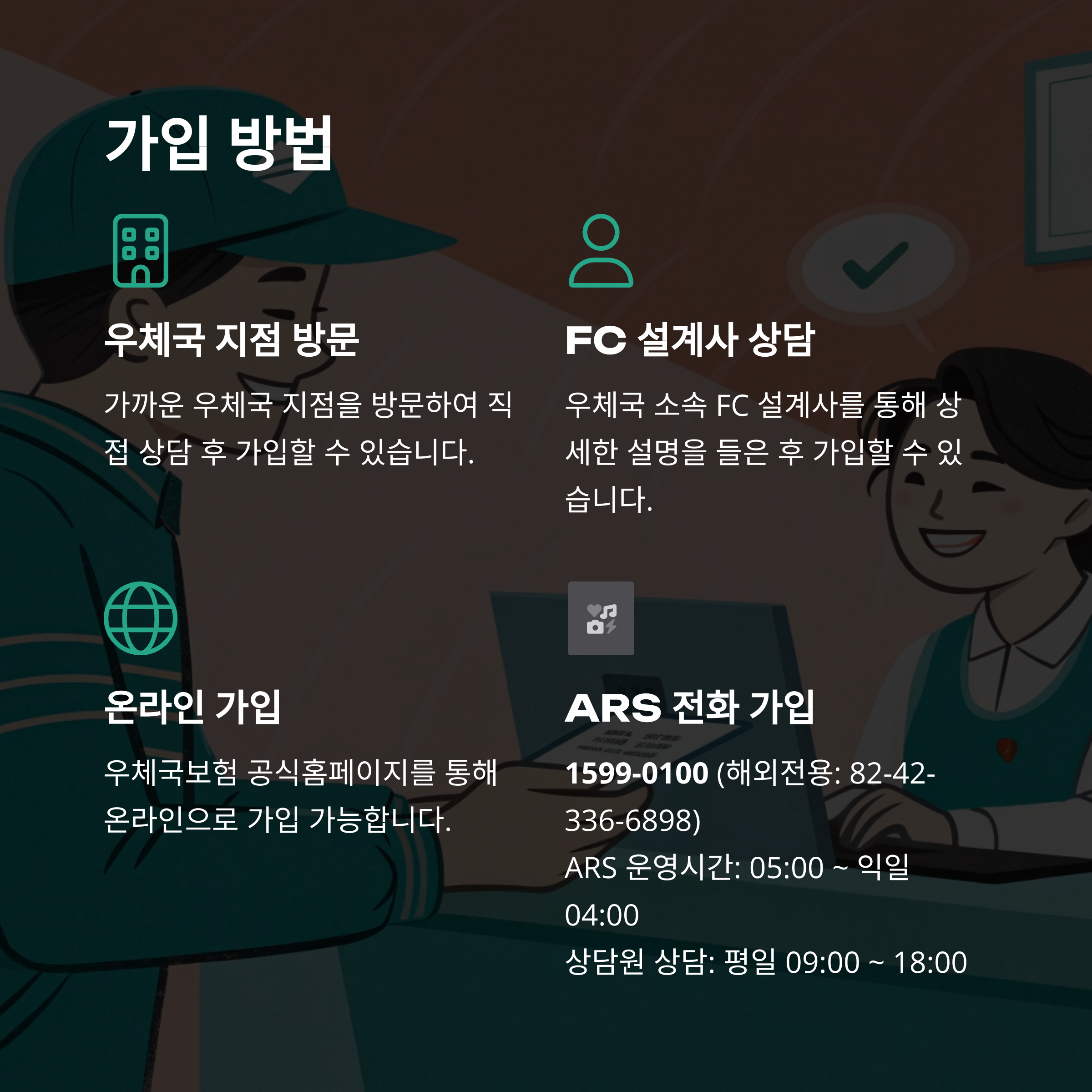 - 가까운 우체국 지점 방문 또는 설계사 상담