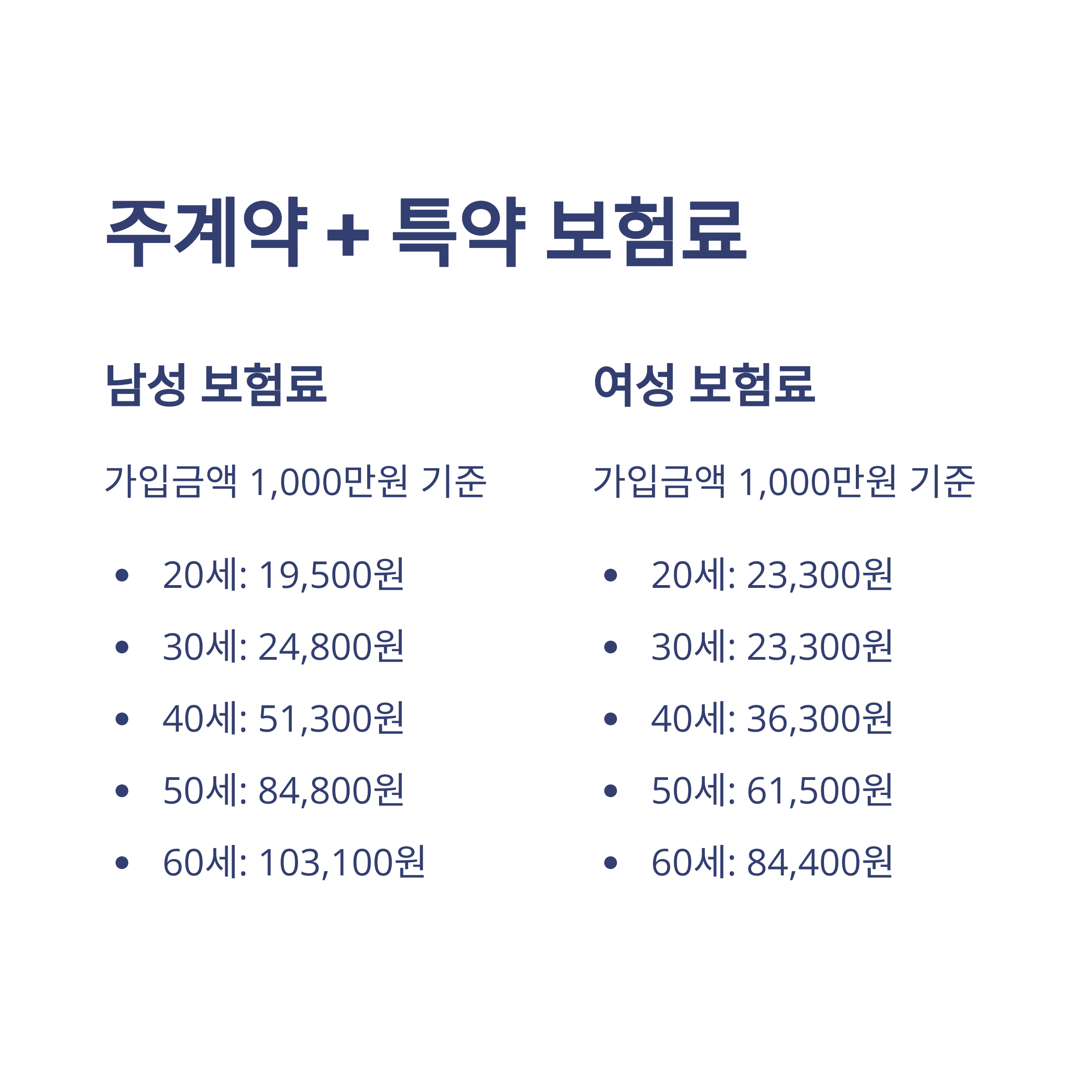 | 연령 | 남성 (주계약) | 여성 (주계약) | 남성 (특약 포함) | 여성 (특약 포함) |