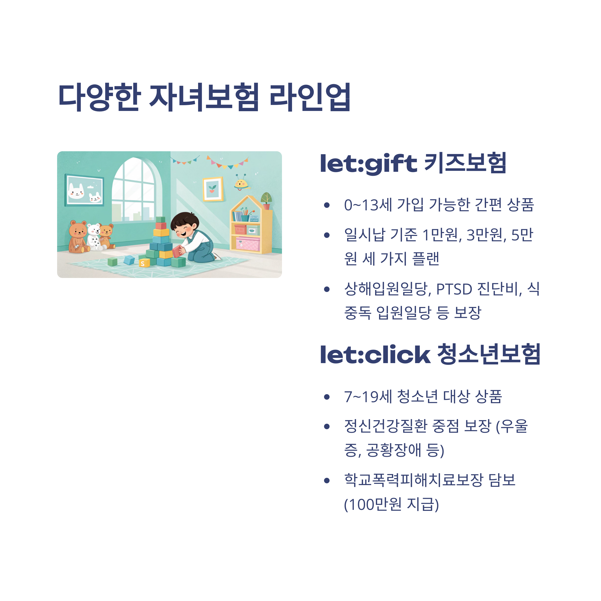 | let:click 청소년보험 | 7~19세 | 정신질환 집중 보장, 학교폭력 피해 치료비 포함 |