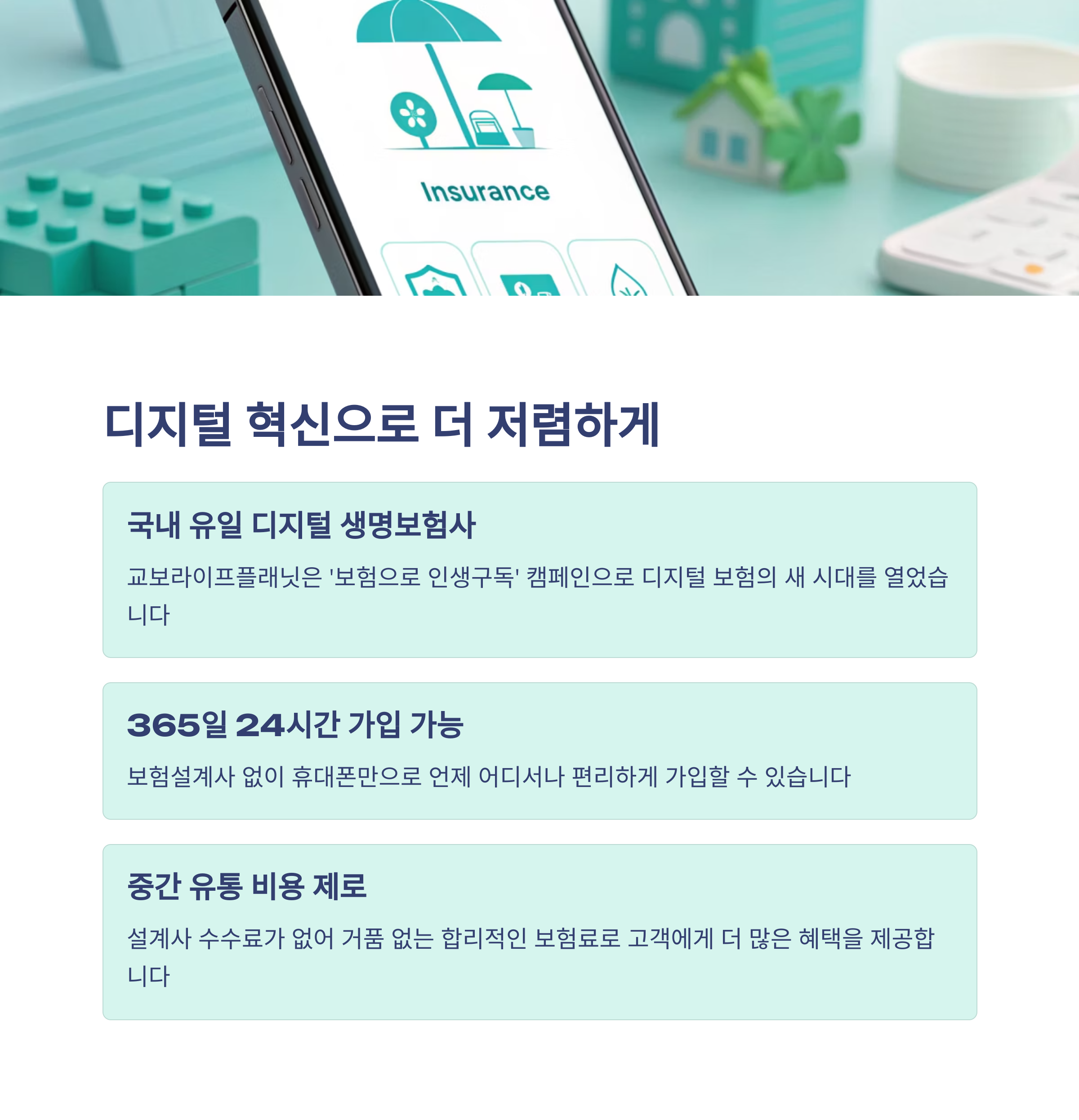 교보라이프플래닛은 국내 최초의 디지털 생명보험사로, 2025년 1월 ‘보험으로 인생구독’이라는 브랜드 캠페인을 통해 주목을 받기 시작했어요. 이 브랜드는 보험이라는 다소 딱딱한 개념을 ‘라이프 구독’처럼 친근하게 바꿔주는 매력이 있었죠. 무엇보다 가입 과정이 간편하다는 게 핵심! 보험설계사 없이도 휴대폰 하나로 24시간 언제든지 가입이 가능하다는 점은, 요즘 바쁜 현대인들에게 딱이에요.