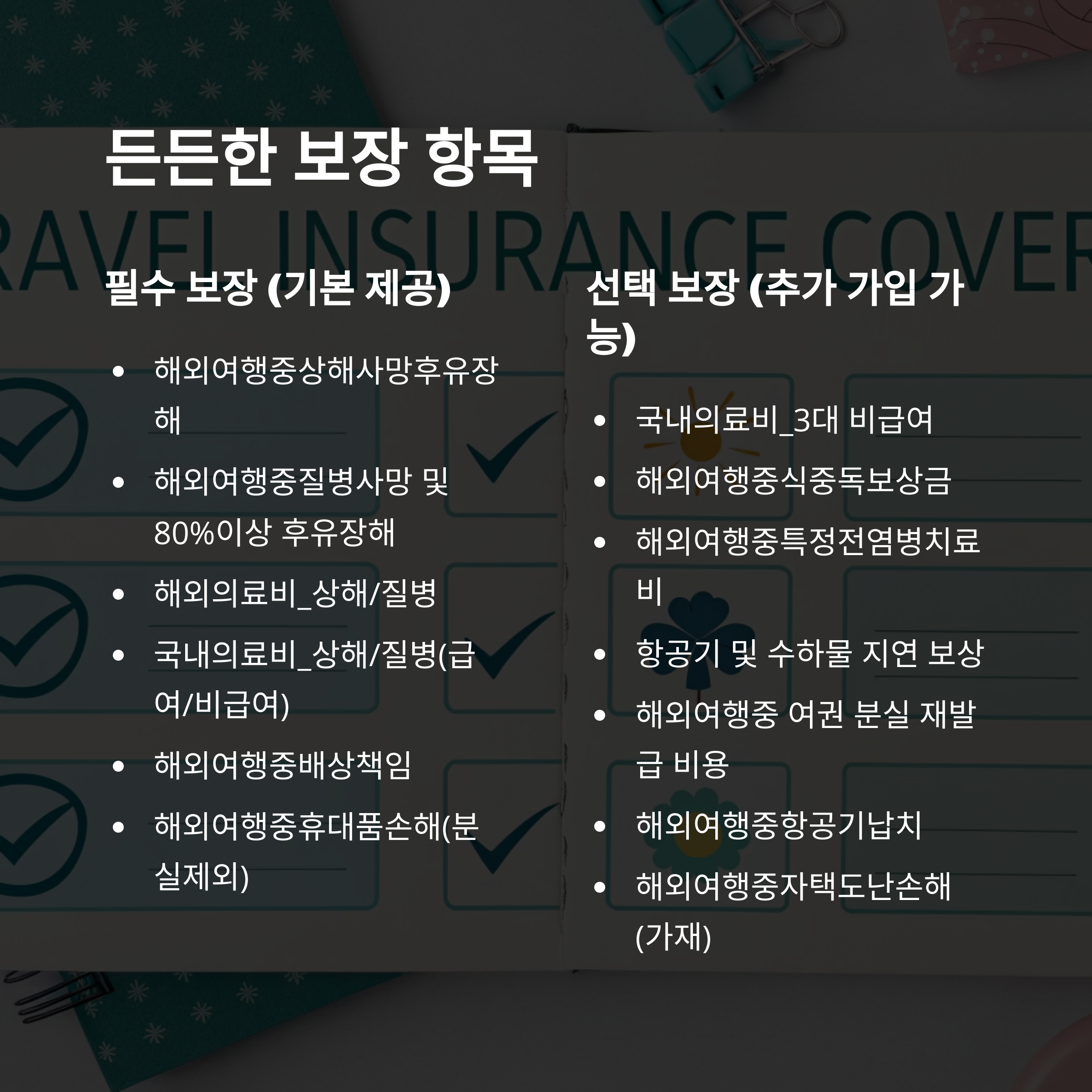 여행자보험의 보장은 크게 기본 항목과 선택 항목으로 나뉘어요. 기본 보장은 상해나 질병, 휴대품 손해 등 여행 중 흔히 겪을 수 있는 문제들을 폭넓게 커버하고, 선택 보장은 보다 세밀한 상황—예를 들어 여권 분실이나 항공기 납치 같은—에 대비할 수 있도록 구성됩니다.