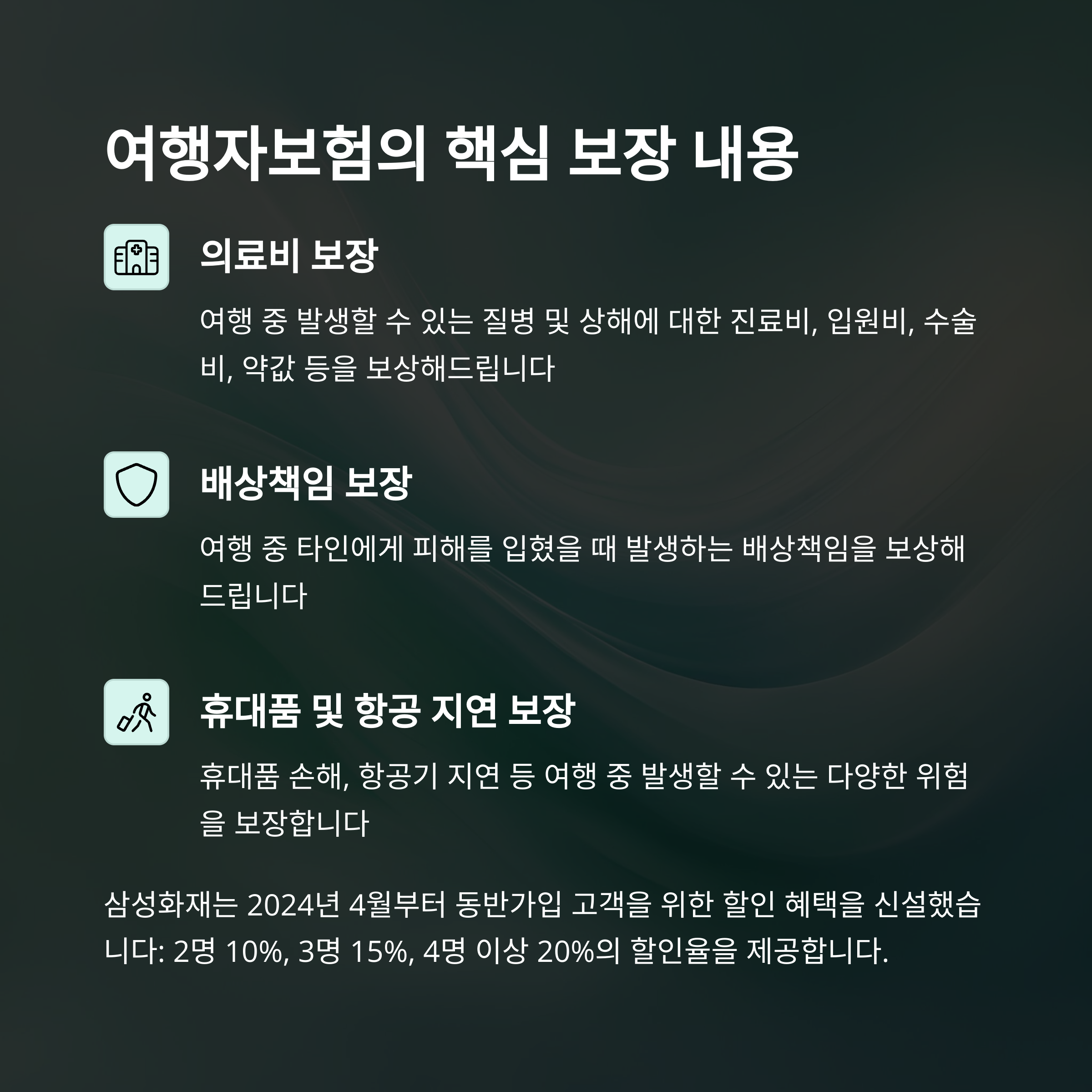 시중 여행자보험의 보장 범위는 상당히 유사하지만, 각 회사가 제공하는 할인 혜택이나 특약 범위는 조금씩 다르답니다. 특히 삼성화재와 같은 대형 보험사는 동반가입 할인 시스템을 운영하고 있어 가족여행이나 친구들과 함께하는 여행자에게 적합하죠.