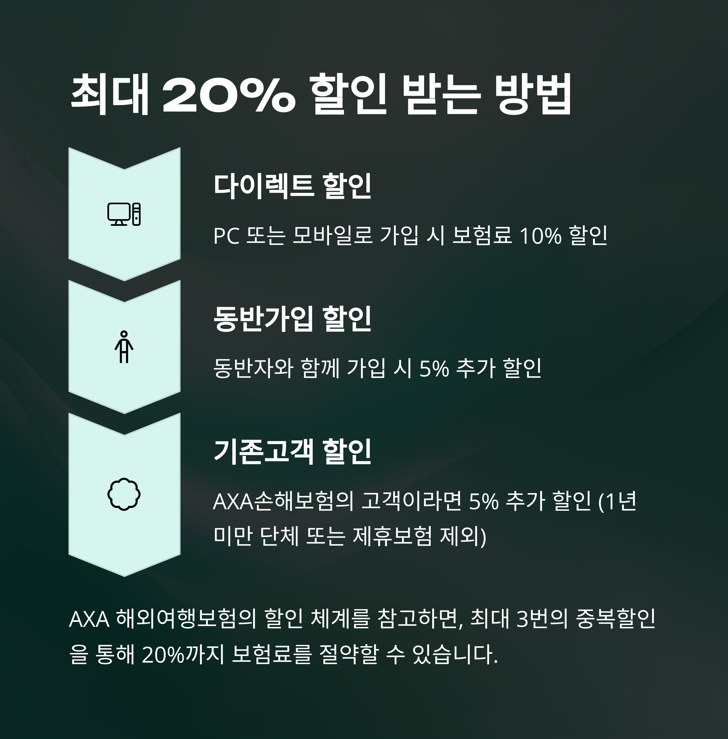 AXA손해보험은 다양한 중복 할인 혜택을 통해 최대 20%까지 보험료를 절감할 수 있게 해줍니다. 세 가지 조건이 충족되면 혜택이 쏟아지죠.