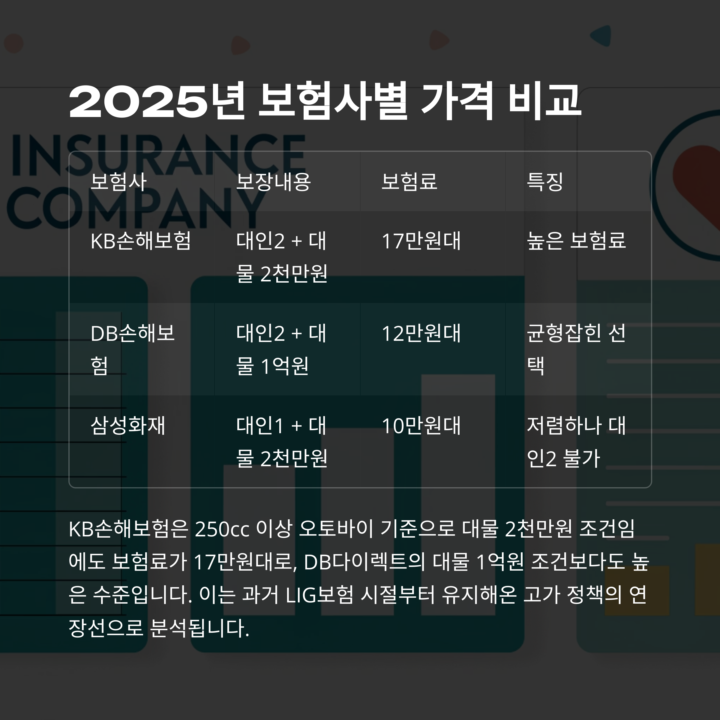과거 LIG 시절부터 이어진 고가 전략이 유지되고 있으며, 보장 항목의 안정성과 전문성 강화에 비용이 반영된 것으로 보입니다.