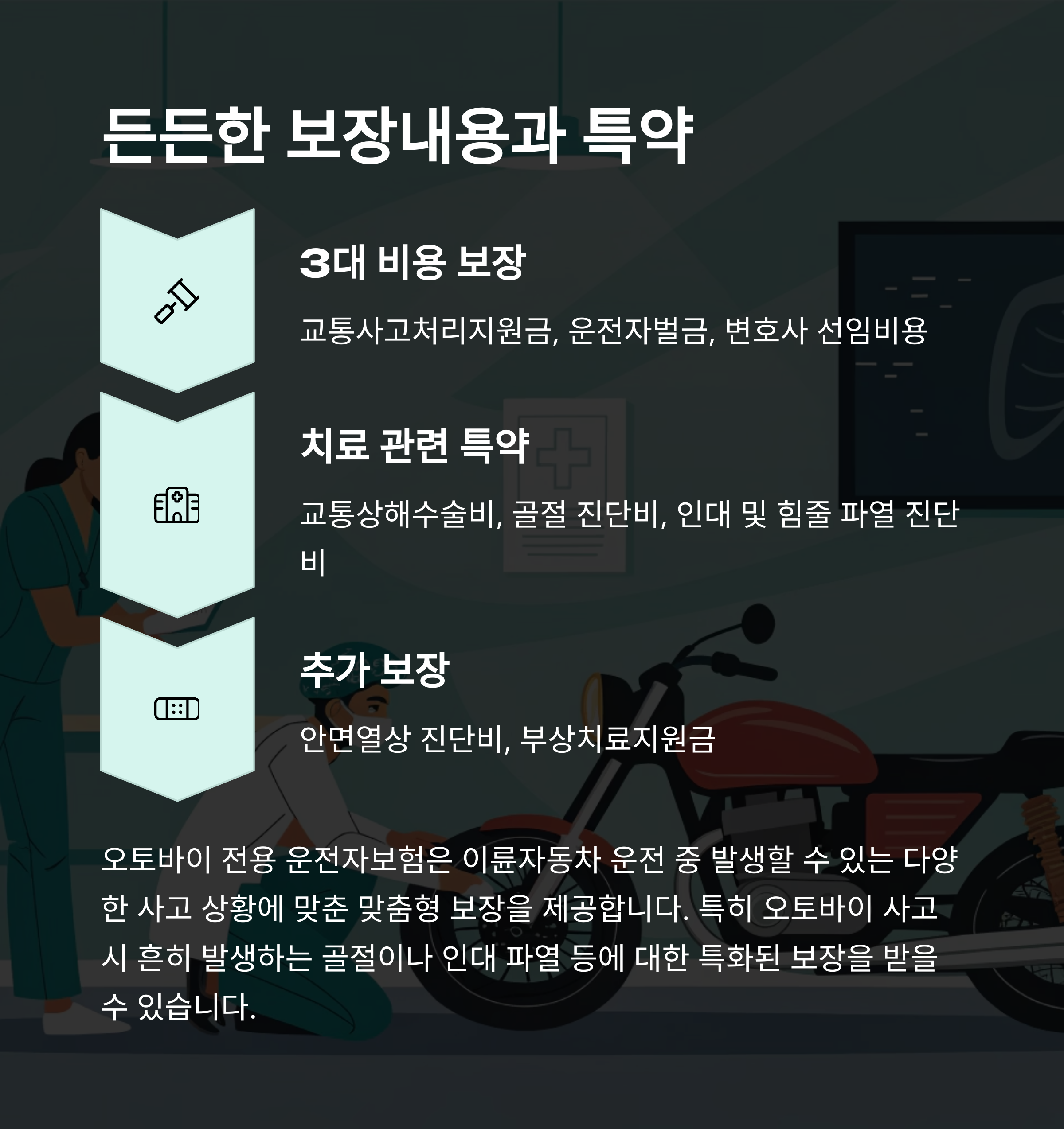 오토바이 전용 운전자보험의 핵심은 바로 교통사고로 인한 비용 보장입니다. 삼성화재는 3대 필수 보장을 제공합니다.