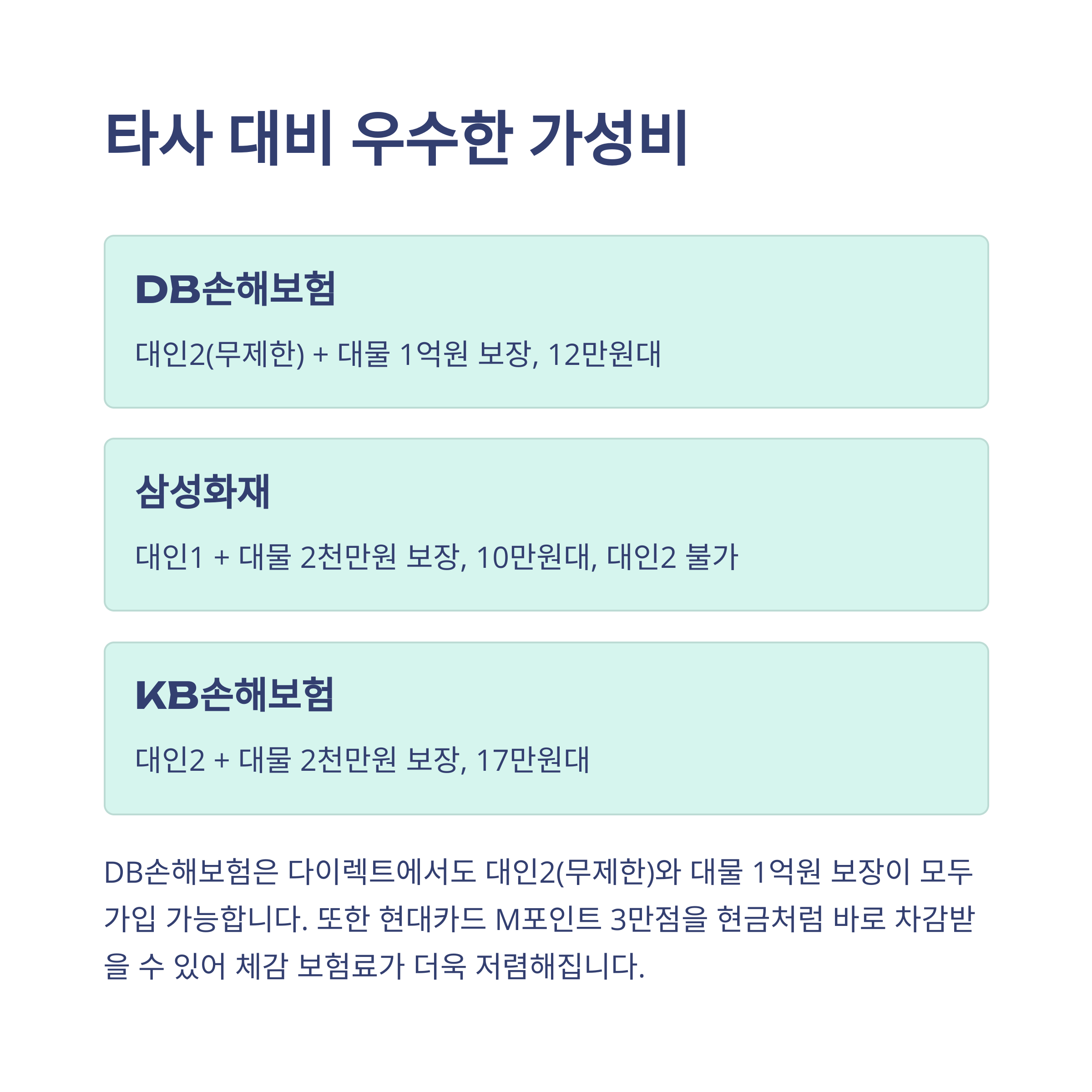 | DB손해보험 | 대인2(무제한) + 대물 1억원 | 12만원대 | 가성비 최고 |