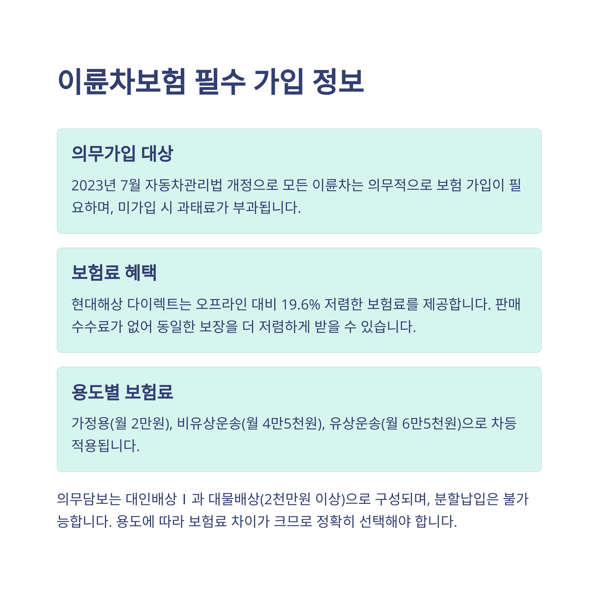 2023년 7월 개정된 법에 따라 모든 이륜차는 보험 가입이 의무입니다. 미가입 시 과태료가 부과됩니다.