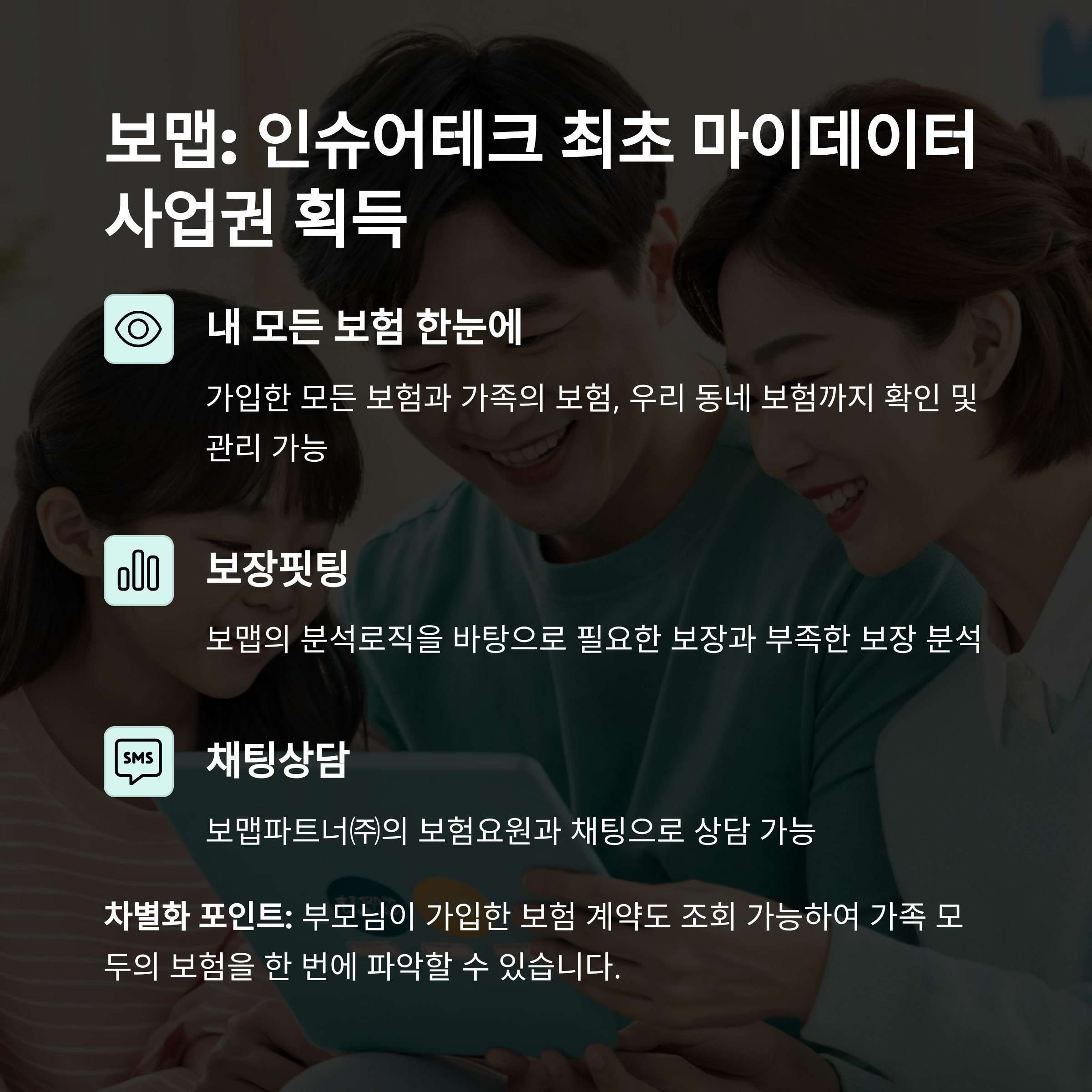 보맵처럼 마이데이터 기능을 활용하는 일부 어플은 부모님이나 자녀의 보험도 함께 조회하고 분석할 수 있는 기능을 제공합니다. 단, 본인 인증 절차를 거쳐야 하며, 앱에 따라 제한이 있을 수 있습니다.