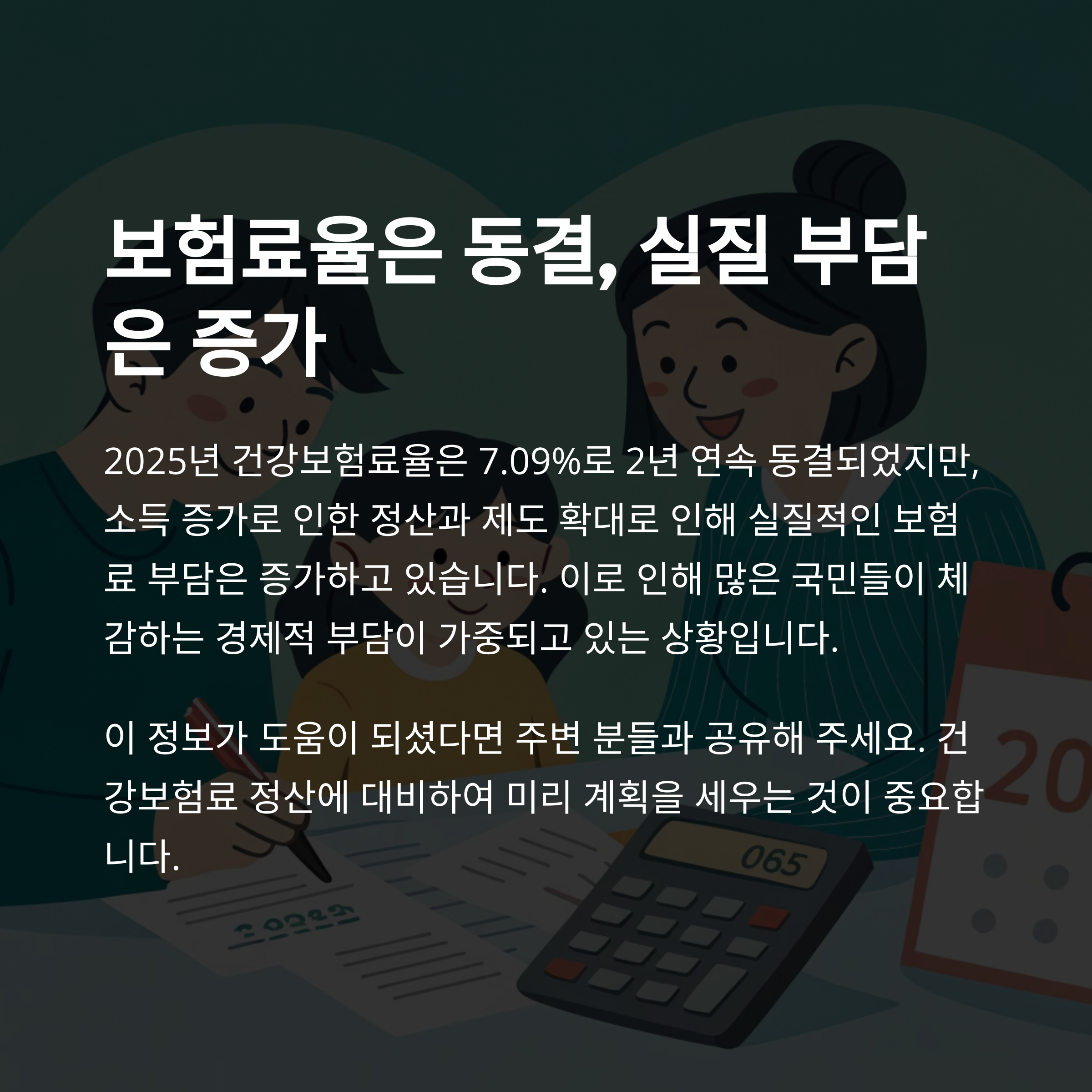 건강보험, 건강보험료율, 2025년 보험료, 보험료 동결, 실질 부담 증가, 건강보험 정산, 장기요양보험, 소득정산제도, 직장인 보험료, 보험료 납부