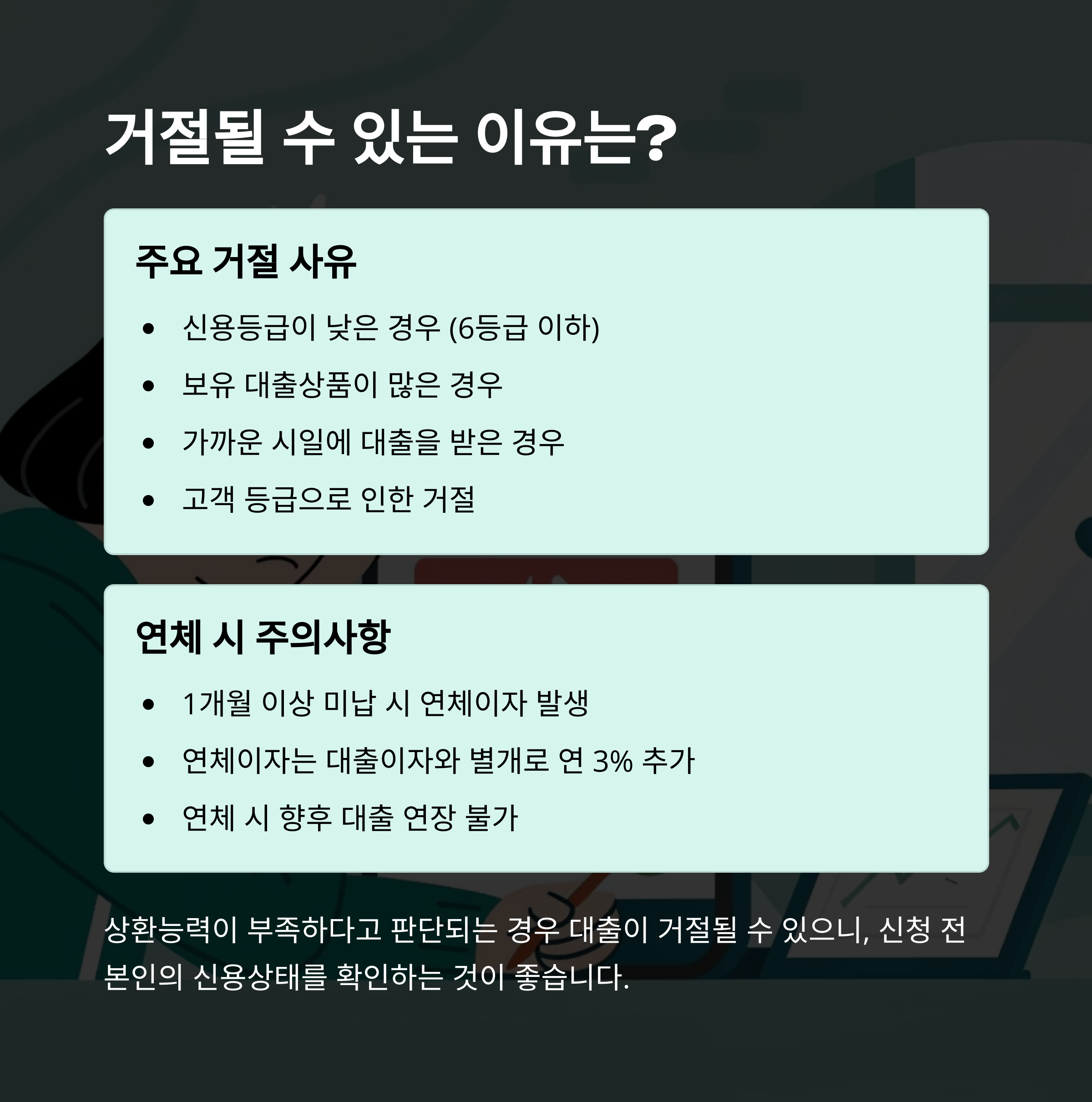 승인률이 높다고 해도, 무조건 승인이 나는 건 아니에요. 신용점수나 기존 대출 상황에 따라 거절될 수 있고, 연체되면 큰 불이익이 생길 수 있습니다.