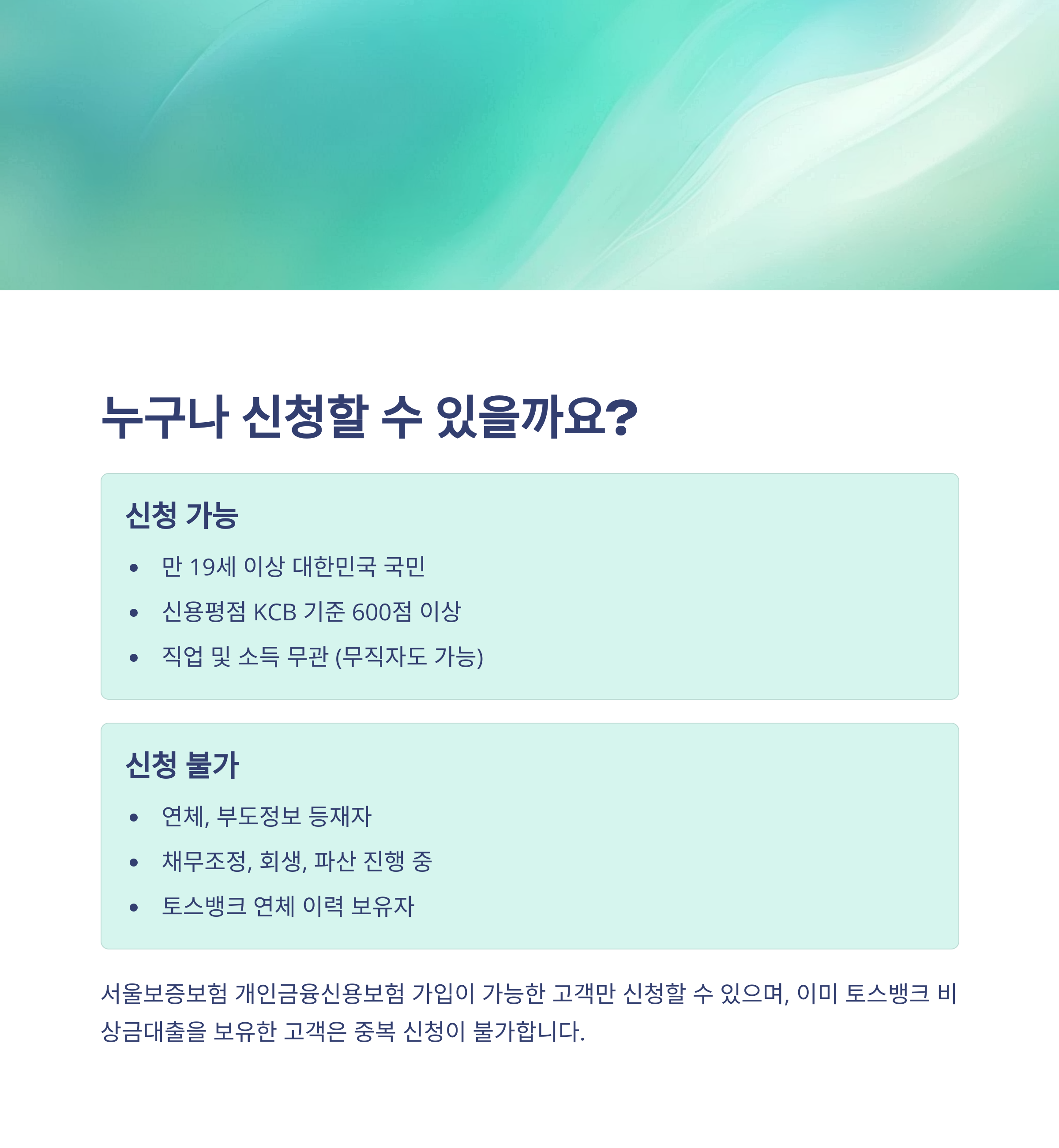 신청하려면 KCB 신용평점 기준으로 600점 이상이어야 하고, 서울보증보험의 보험 가입이 가능해야 해요. 다만 연체 이력이나 회생, 파산, 금융사기 이력이 있는 분들은 제외됩니다. 현재 토스비상금대출을 이미 이용 중인 경우에도 중복 신청은 안 돼요.