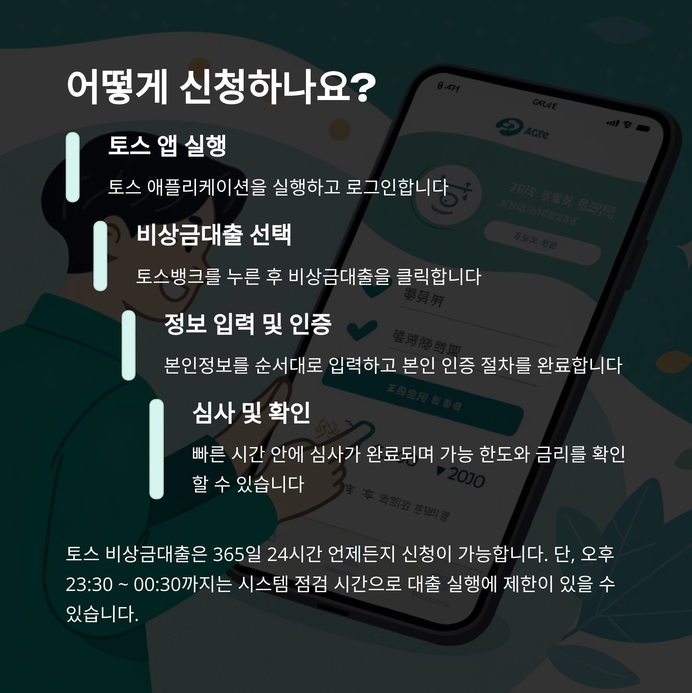 토스 비상금대출은 모바일 하나로 5분이면 끝나요. 별다른 서류도 필요 없고, 집에서 침대에 누운 채로도 가능하다는 점이 진짜 매력이죠. 신청은 토스 앱에서 가능합니다. 단, 밤 11시 30분부터 12시 30분까지는 시스템 점검 시간이라 신청이 일시적으로 제한될 수 있어요.