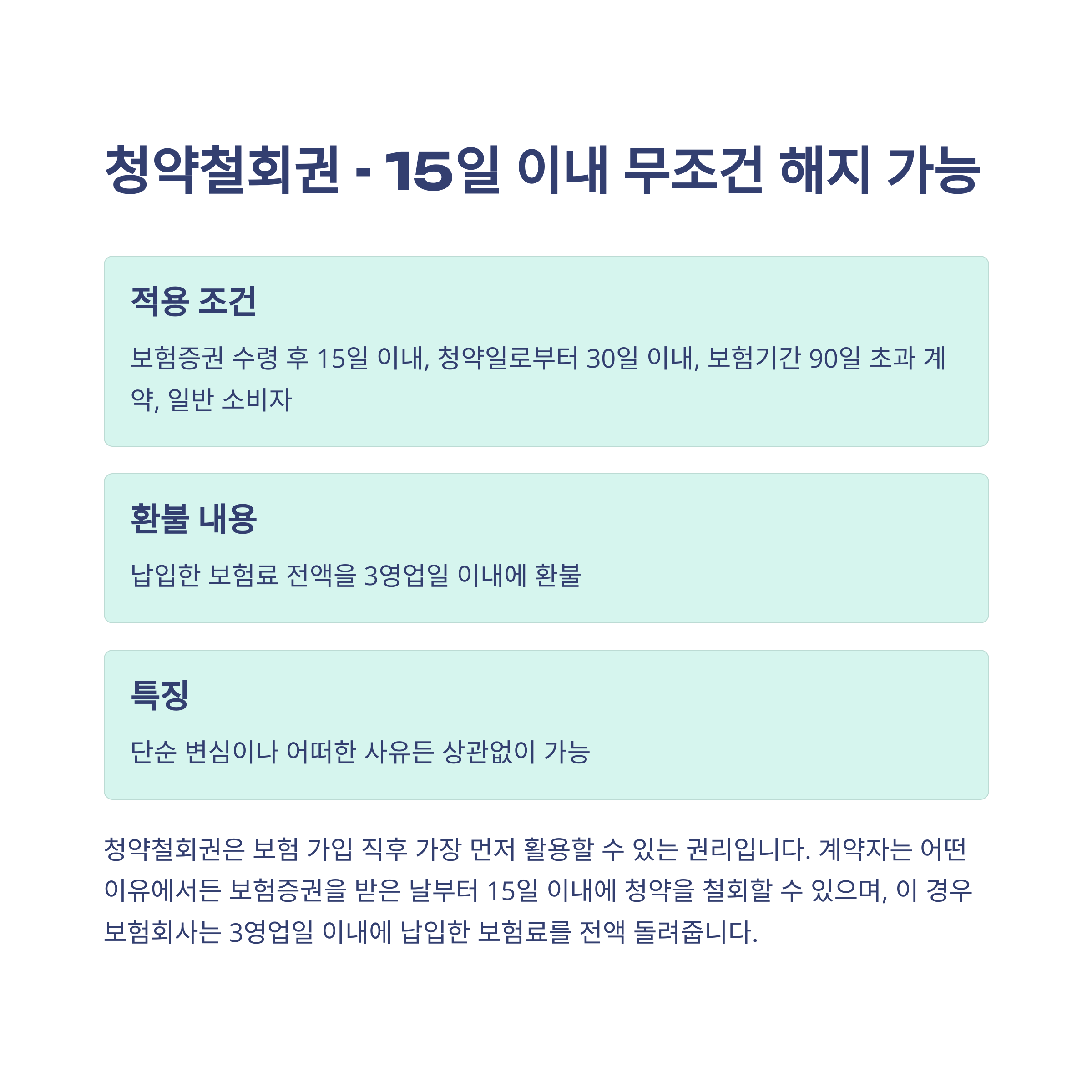보험에 가입하고 나서 갑자기 마음이 바뀌었다면? 걱정 마세요! 청약철회권을 활용하면 15일 안에 아무 조건 없이 해지가 가능합니다. 보험증권을 받은 날부터 15일 이내, 또는 청약일로부터 30일 이내면 언제든지 마음 바꿔도 괜찮다는 거죠. 게다가 3영업일 내에 전액 환불까지 받을 수 있어요.