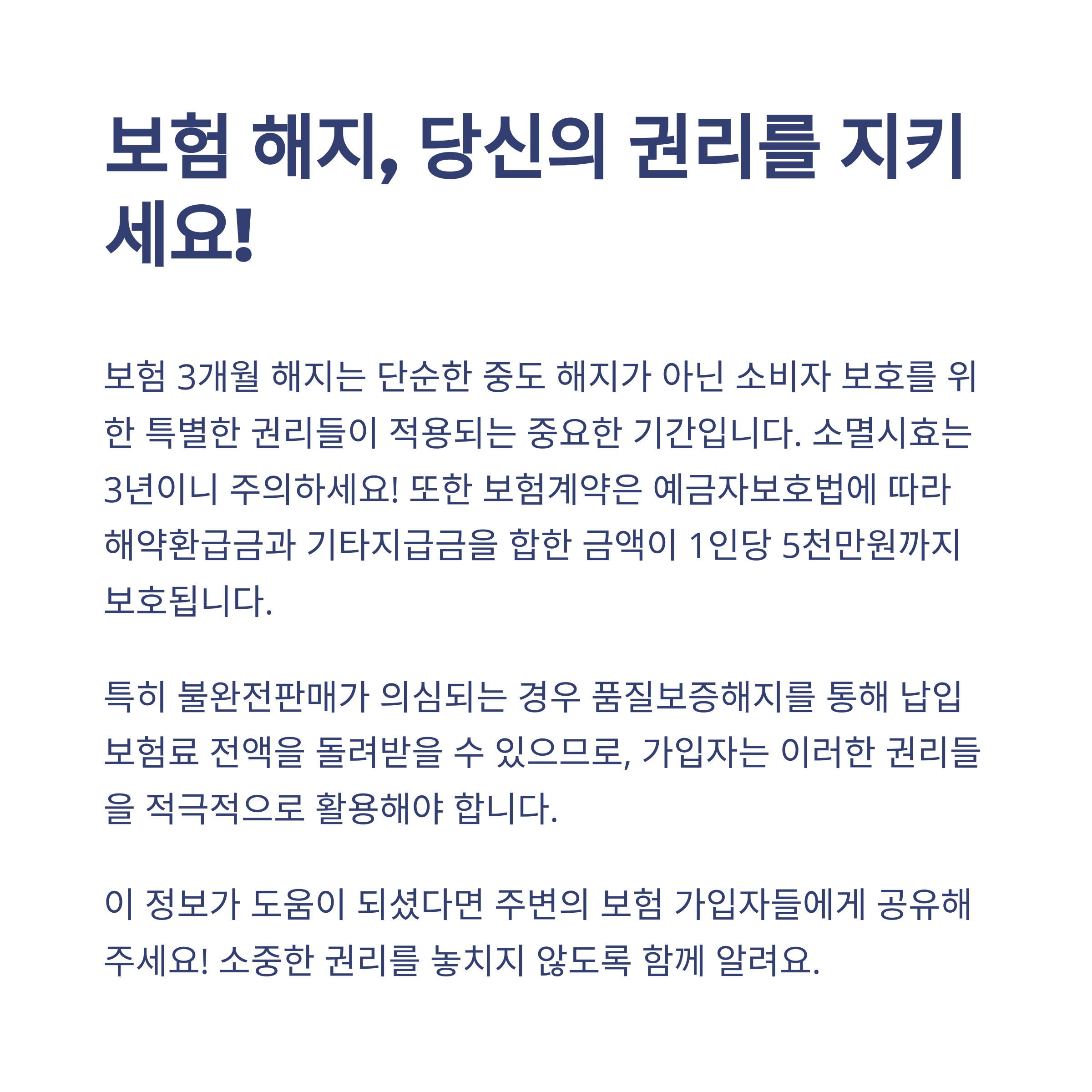 보험이라는 게 원래 어렵고 복잡한 줄만 알았는데요, 이렇게 3개월 이내에 우리가 활용할 수 있는 권리가 있다는 걸 알고 나니까 왠지 든든해졌어요. 나중에라도 "왜 미리 안 알았지?" 후회하지 않으려면, 지금 이 글이 작게나마 도움이 되었으면 좋겠어요. 혹시 주변에 보험 해지를 고민 중인 분이 있다면 이 정보 꼭 알려주세요. 댓글로 여러분의 경험도 공유해주시면 같이 배워나갈 수 있을 것 같아요!