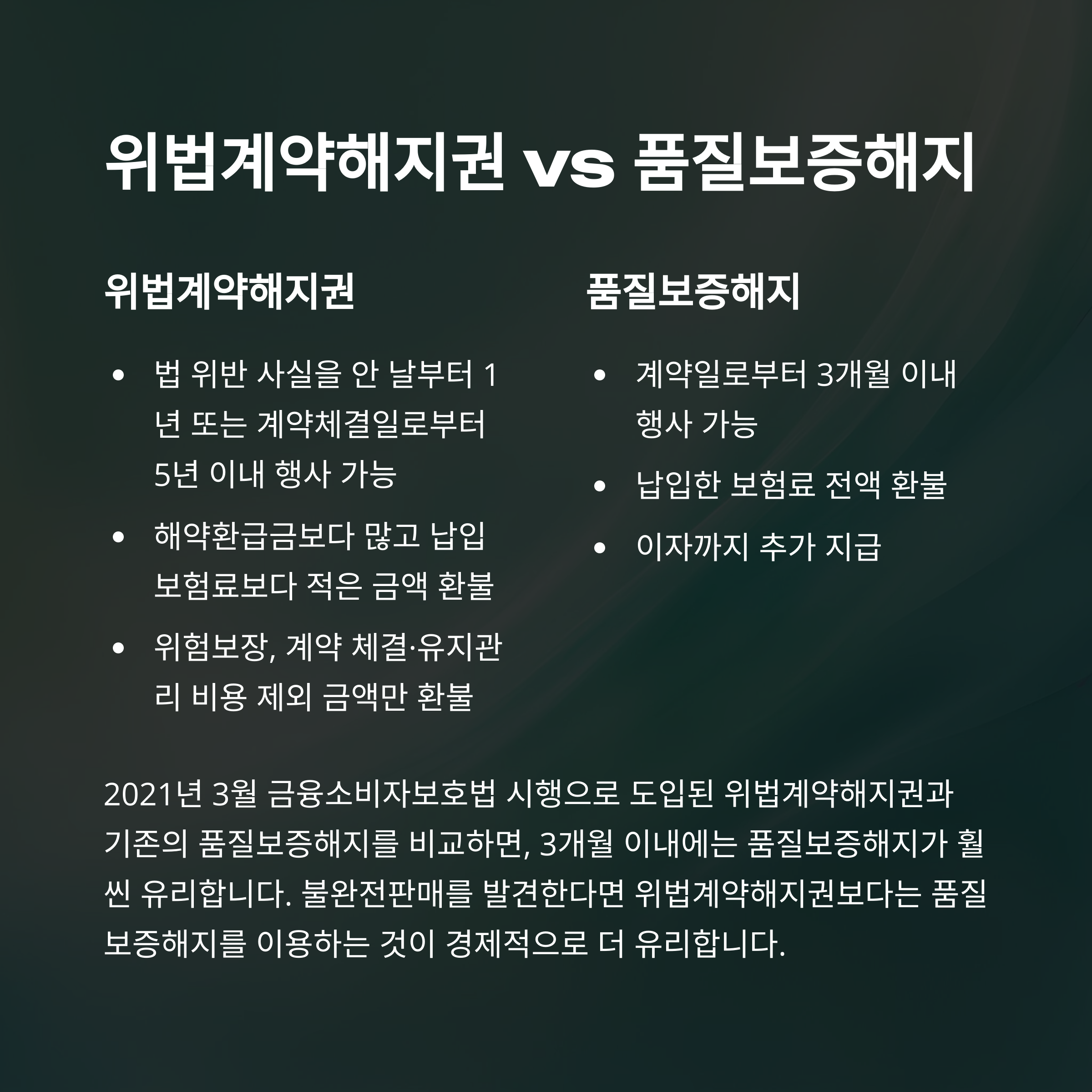 2021년부터 생긴 위법계약해지권은 듣기엔 멋지지만 실제 환불 금액은 그리 크지 않을 수 있어요. 품질보증해지는 단순하게 전액 환불에 이자까지 포함되니, 3개월 이내에는 무조건 품질보증해지가 유리합니다.