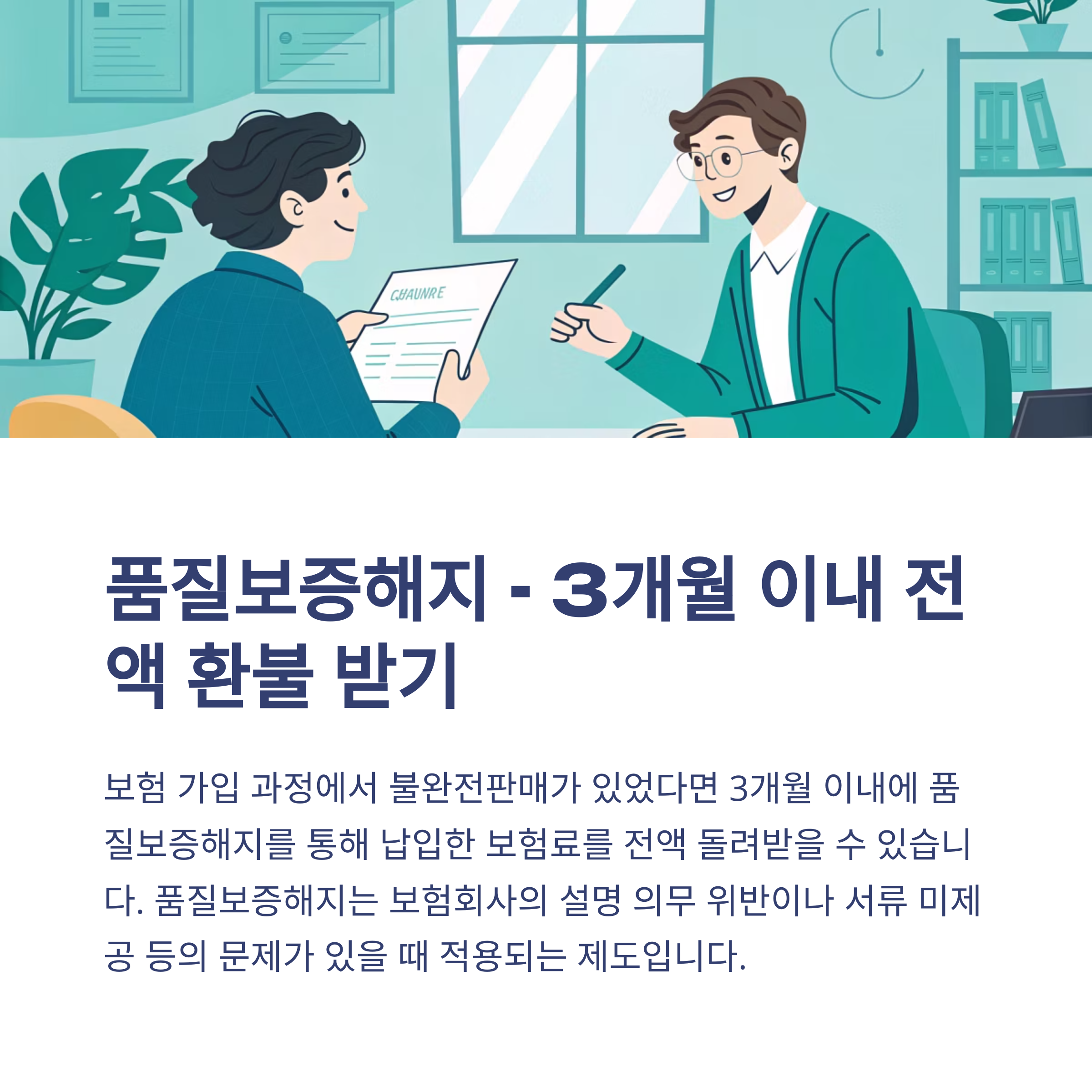 보험 가입 당시 약관 설명을 제대로 듣지 못했거나, 서류를 못 받았거나, 심지어 자필서명도 하지 않았다면? 품질보증해지를 신청하세요. 계약일로부터 3개월 이내에만 신청하면, 납입한 보험료 전액에 이자까지 돌려줍니다.