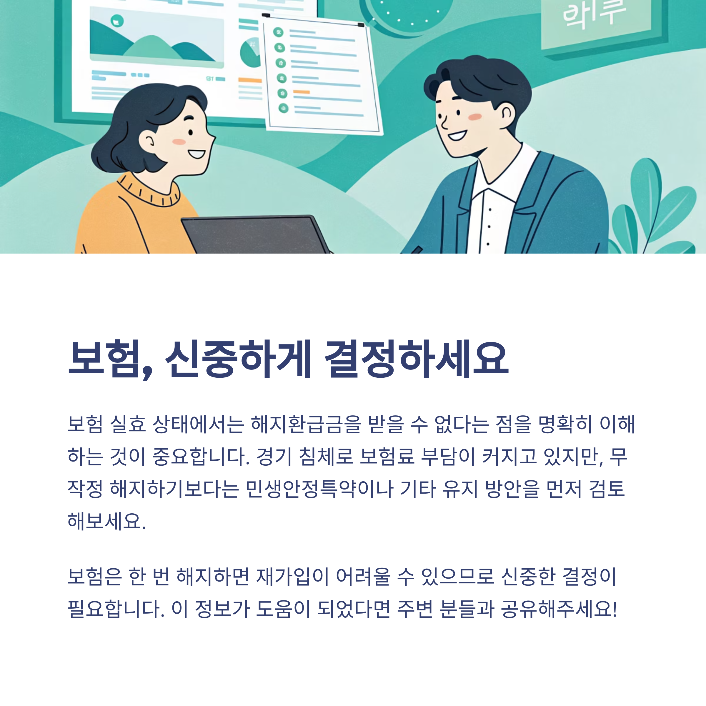 이제 보험 실효와 해지의 차이, 그리고 해지환급금에 대해 조금은 더 명확하게 이해가 되셨나요? 저도 처음엔 너무 복잡하게 느껴졌는데, 이렇게 하나씩 정리하다 보니 보험을 해지하기 전에 다시 한 번 생각해보게 되더라고요. 요즘처럼 경제적으로 어려운 시기엔 보험료도 아끼고 싶지만, 무턱대고 해지하기보다는 가능한 대안을 먼저 살펴보는 게 훨씬 현명한 선택일 수 있어요. 오늘 내용이 여러분의 보험 유지에 실질적인 도움이 되길 바랍니다. 혹시 더 궁금한 점 있으시면 언제든지 댓글로 남겨주세요. 함께 이야기 나누며 더 나은 선택을 해봐요!