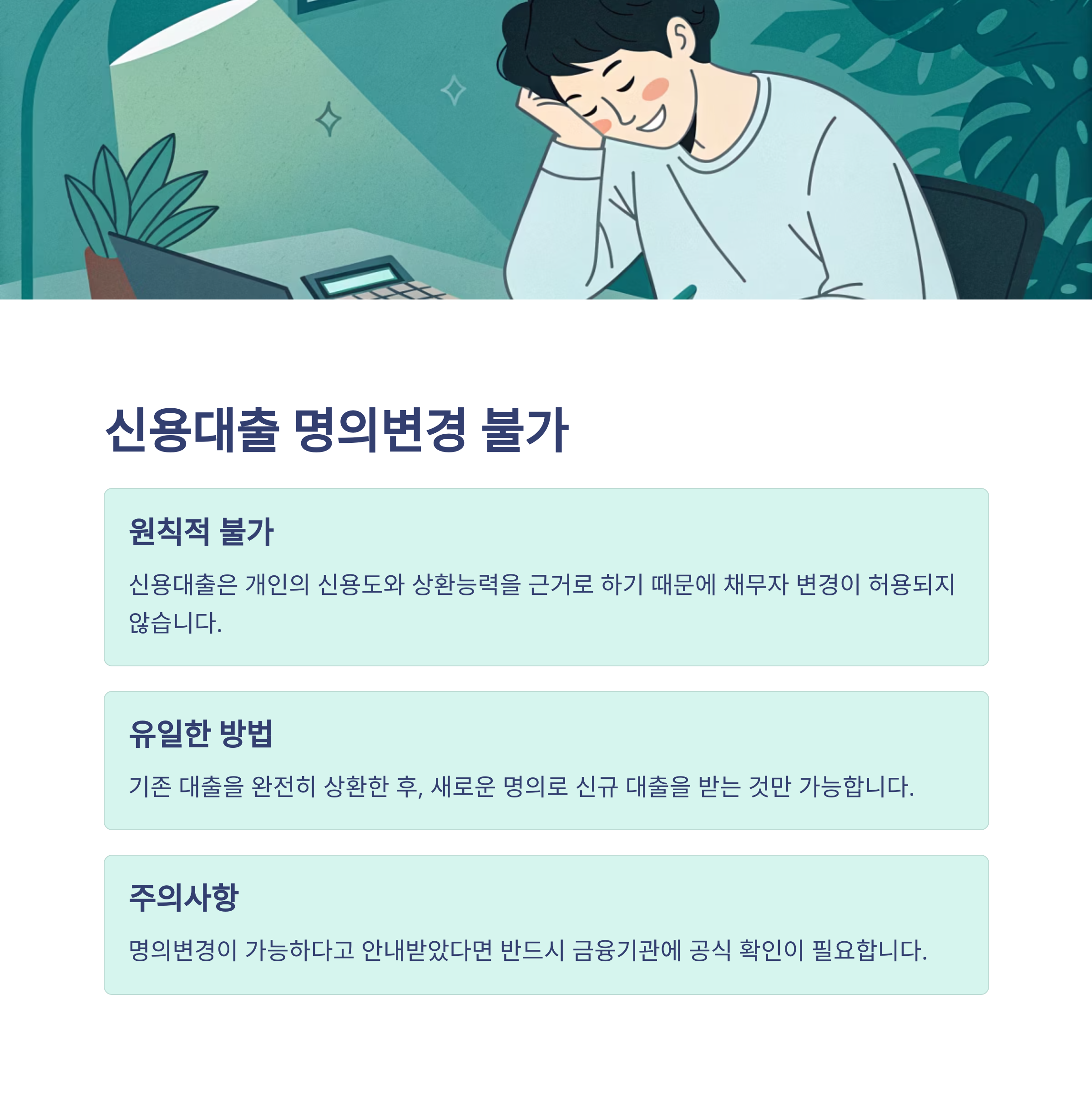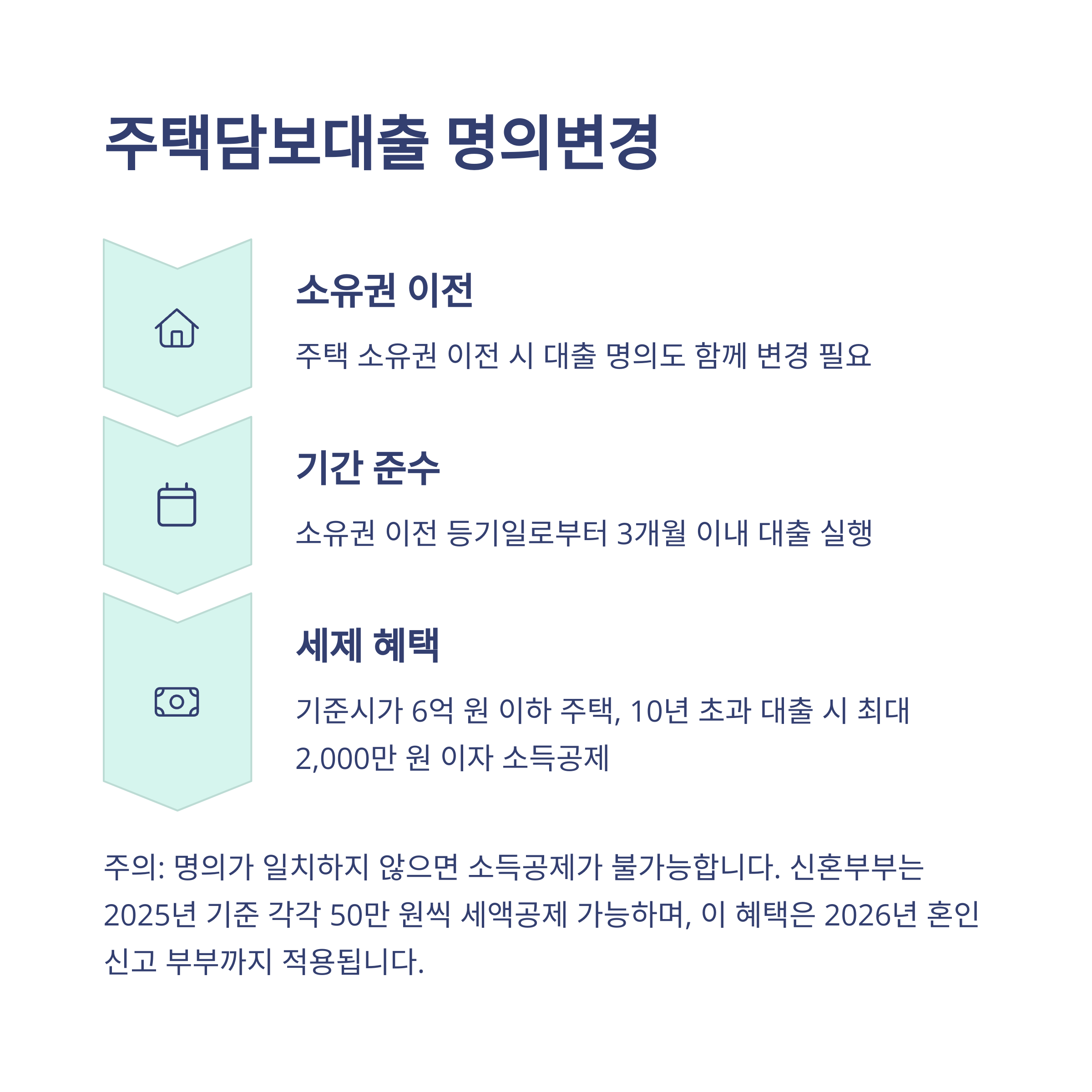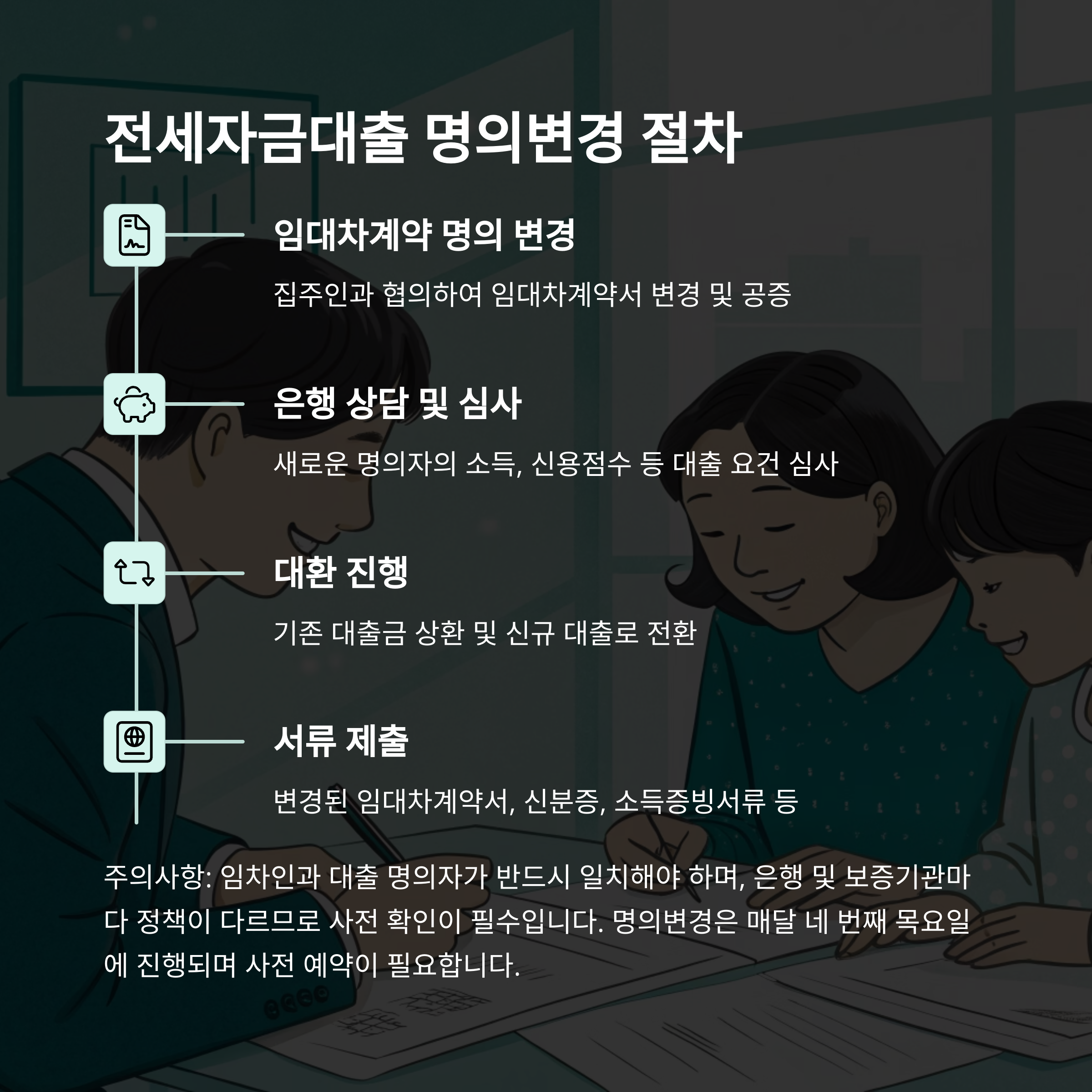 간혹 은행에서 '명의변경 가능'하다고 설명하는 경우도 있지만, 이는 기존 대출 상환 후 신규 대출로 대체하는 방식일 뿐, 명의변경 자체는 아니에요. 꼭 혼동하지 마세요.