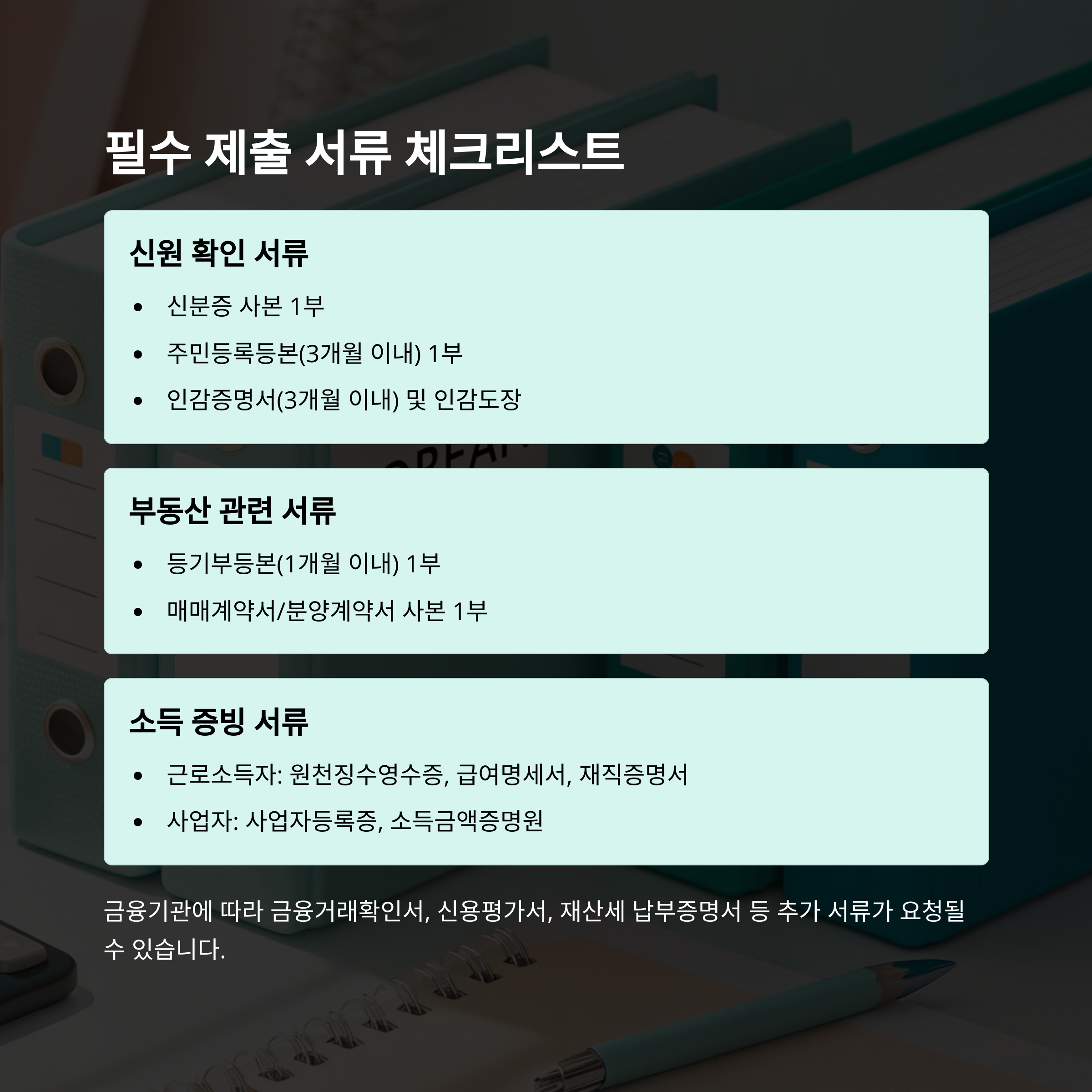 - 기타: 신용평가서, 재산세 납부증명서 등 금융기관 요청 시