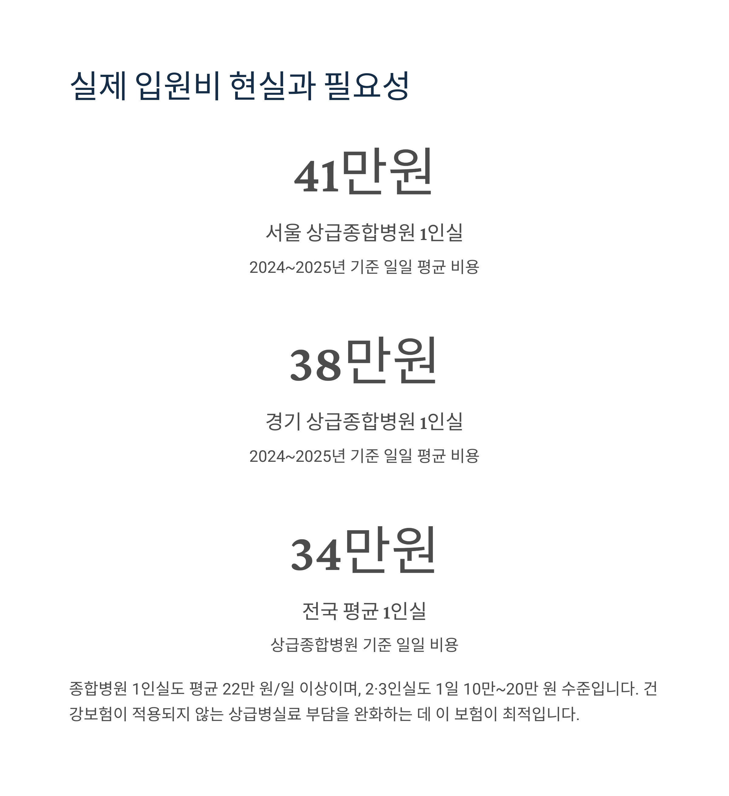 • 서울 상급종합병원 1인실: 평균 41만 원/일