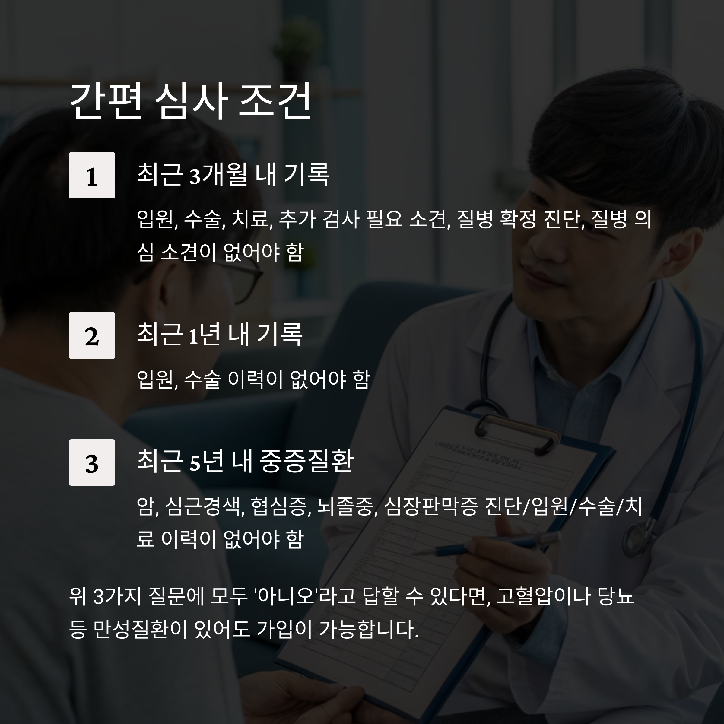 고혈압, 당뇨, 고지혈증처럼 만성질환이 있거나 과거 병력이 있어 일반 보험 가입이 어려웠던 분들이 쉽게 가입할 수 있도록 설계된 보험입니다.