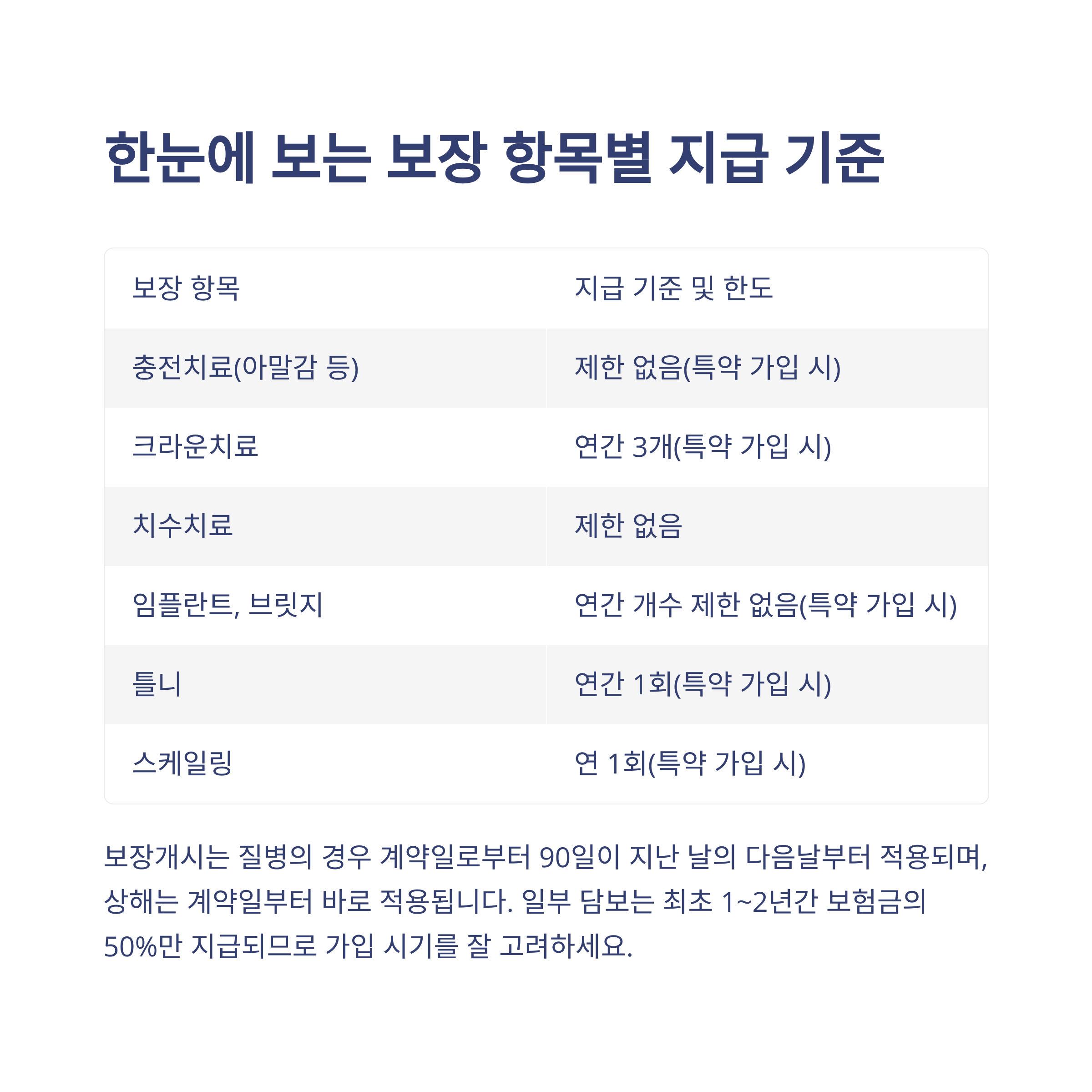 이제 가장 궁금해하실 만한 보장 항목별 지급 기준에 대해 좀 더 자세히 알아볼까요? 저도 이 부분을 가장 꼼꼼히 살펴봤거든요. 충전치료, 크라운치료, 임플란트 등 주요 치료는 물론, X-ray나 스케일링 같은 예방 치료까지 보장해준다는 점이 좋았어요. 특히 질병으로 인한 보장은 계약일로부터 90일이 지난 다음날부터, 상해는 계약일부터 바로 보장된다는 점도 중요합니다. 다만, 일부 담보는 최초 1~2년간 감액 지급(예: 1년 이내 50%, 2년 이내 50%)될 수 있으니, 가입 전에 약관을 꼭 확인해보셔야 해요. 아래 표에서 핵심 내용을 한눈에 확인해보세요. 더 자세한 내용은 DB손해보험 상품설명서를 참고하는 것을 추천드려요.