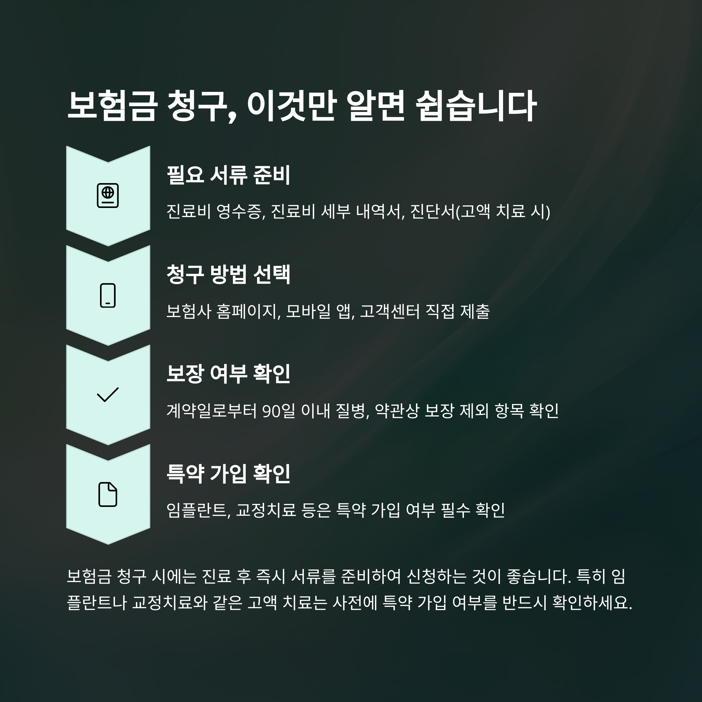 - 유의사항 3 (특약 여부): 임플란트, 교정 등은 반드시 특약 가입 여부 확인