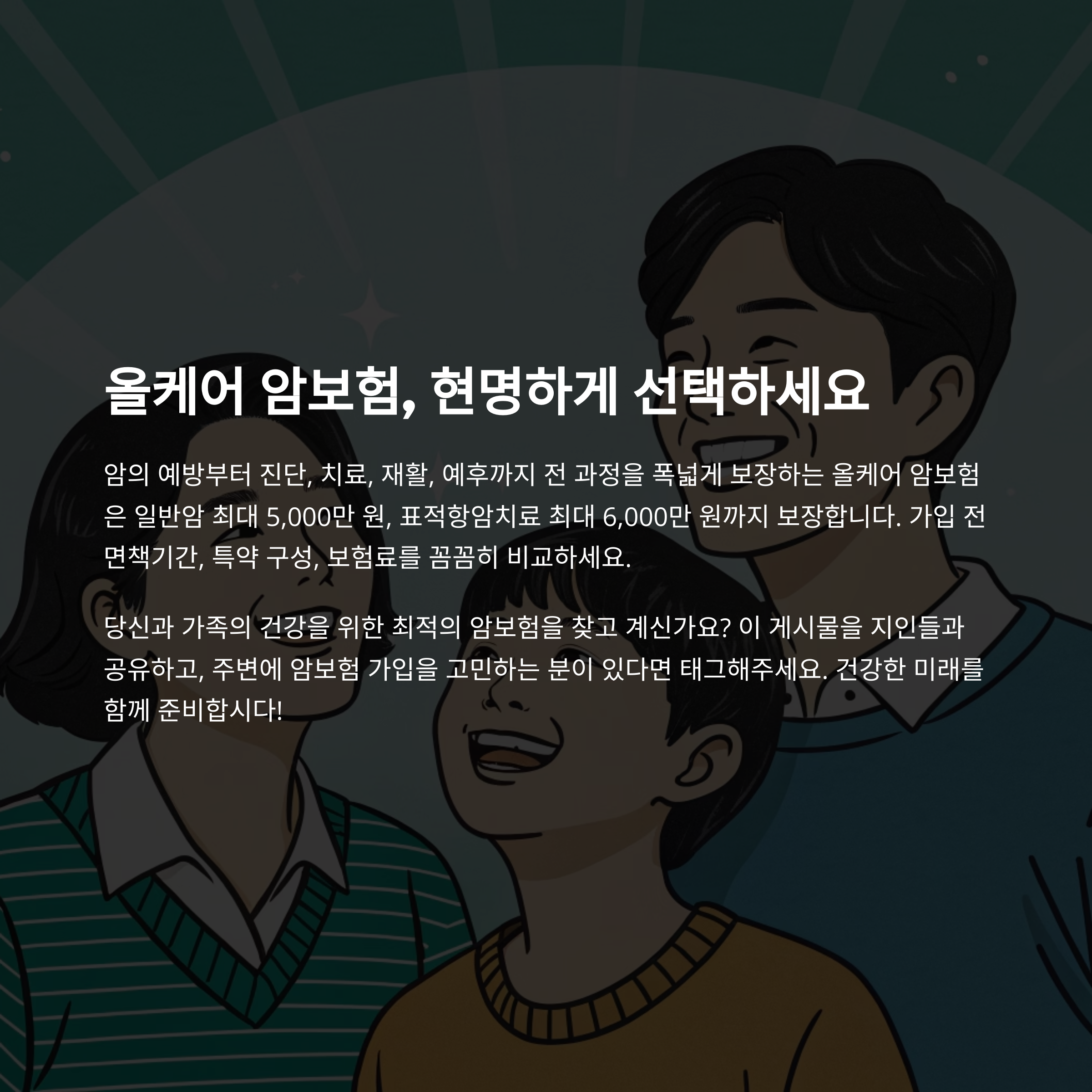 여러분, 암보험 하나만 잘 가입해도 인생의 큰 리스크를 줄일 수 있다는 사실, 새삼 느껴졌어요. ‘올케어 보장 꽉 채운 암보험’은 단순한 진단금 이상을 넘어, 진짜 필요한 순간에 든든한 지원군이 되어줄 수 있는 좋은 선택입니다. 오늘 글이 여러분의 보험 선택에 조금이라도 도움이 되었길 바라며, 혹시 궁금한 점이나 경험담이 있다면 댓글로 함께 나눠주세요. 보험은 함께 비교하고 고민할수록 더 나은 결정을 내릴 수 있답니다!