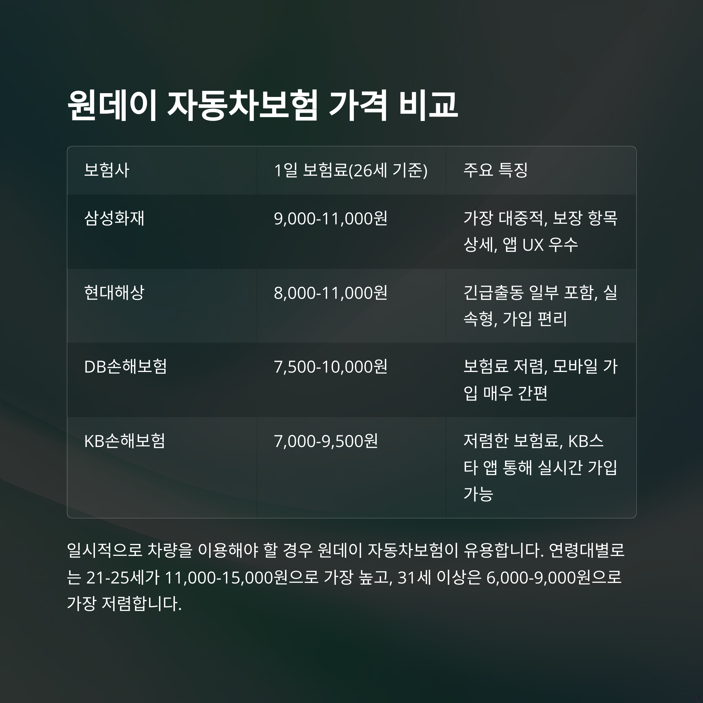2025년 기준으로 주요 보험사들이 제공하는 1일 자동차보험의 가격대를 비교해볼게요.