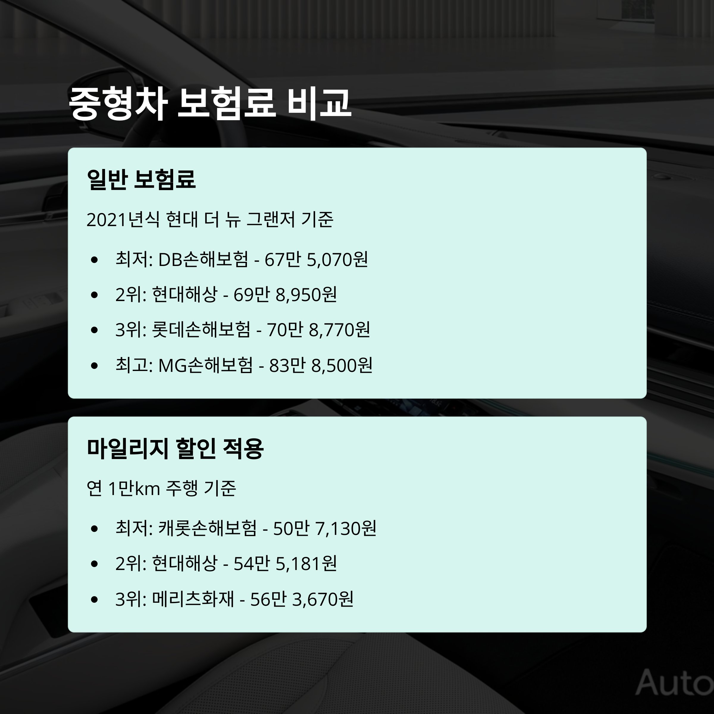 보험료는 차량 종류에 따라 천차만별이에요. 여기선 중형차, 미니밴, 수입차 기준으로 주요 보험사의 보험료를 비교해봤어요.