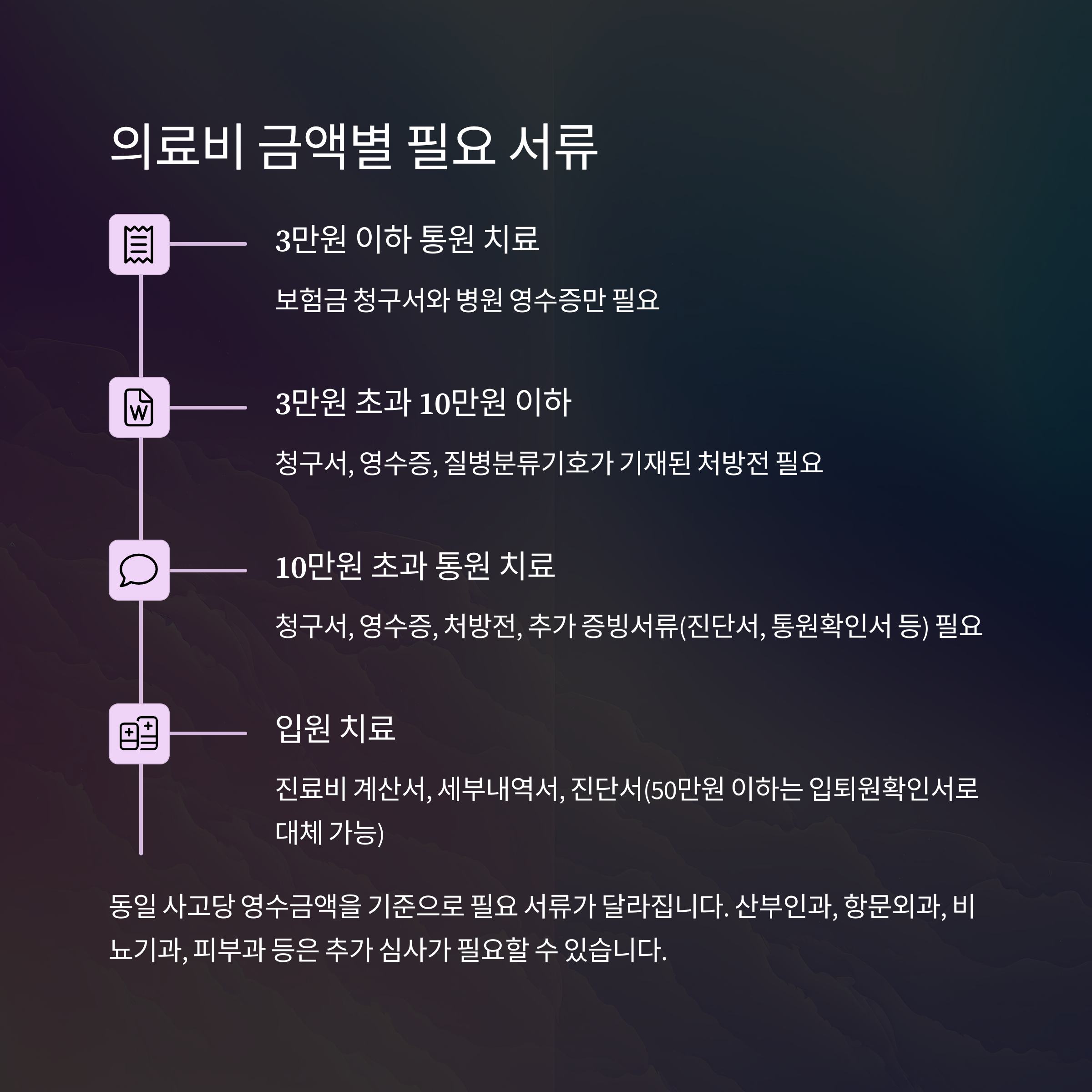 의료비 금액에 따라 제출해야 할 서류가 조금씩 달라집니다. 특히 10만 원을 기준으로 추가 서류가 필요하므로 꼼꼼히 확인해 주세요.