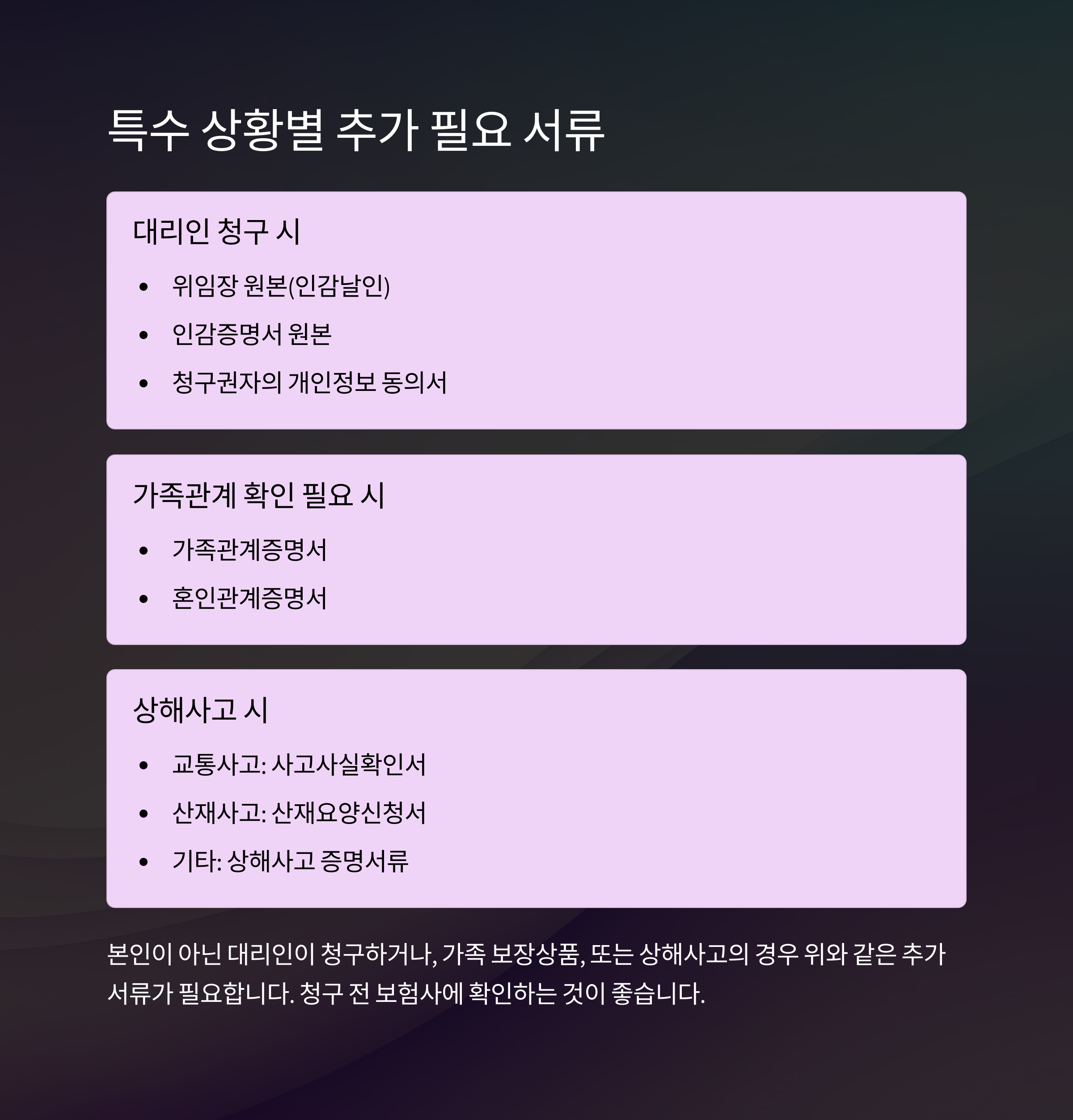 | 10만원 초과 | 보험금 청구서, 병원 영수증, 처방전, 추가 증빙서류(진단서, 통원확인서 등) |