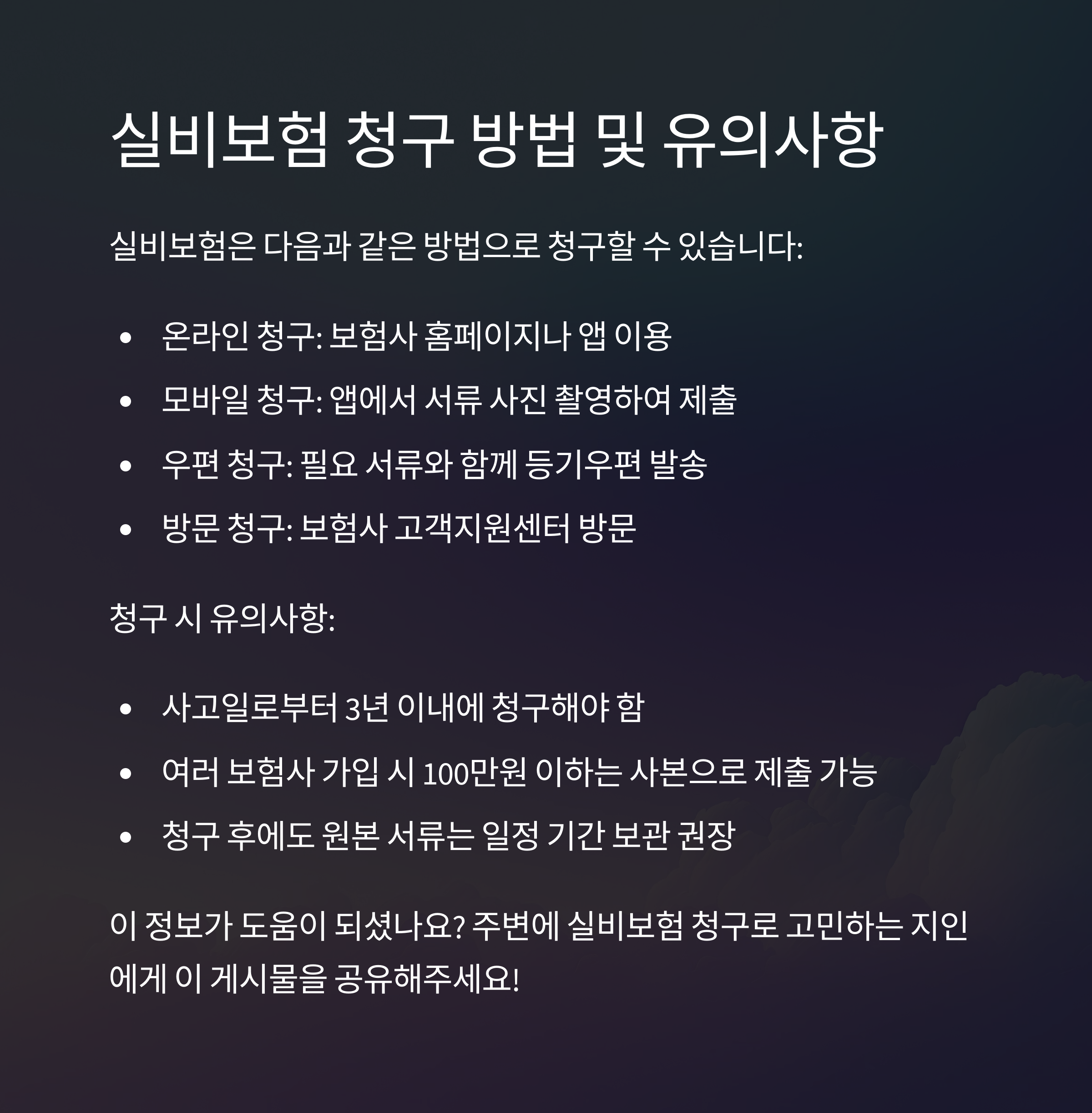 오늘은 이렇게 실비보험 청구 시 필요한 서류를 꼼꼼히 정리해보았어요. 처음에는 막막하고 어려워 보여도, 필요한 서류만 잘 준비하면 누구나 손쉽게 청구할 수 있답니다. 특히 요즘은 모바일 앱으로 간편하게 청구할 수 있어서 더 편해졌어요. 이 글이 여러분의 실비보험 청구에 큰 도움이 되었기를 바랍니다 😊 혹시 더 궁금한 점이 있거나 경험담이 있다면 댓글로 함께 나눠주세요! 서로의 경험이 누군가에겐 큰 도움이 될 수 있거든요.