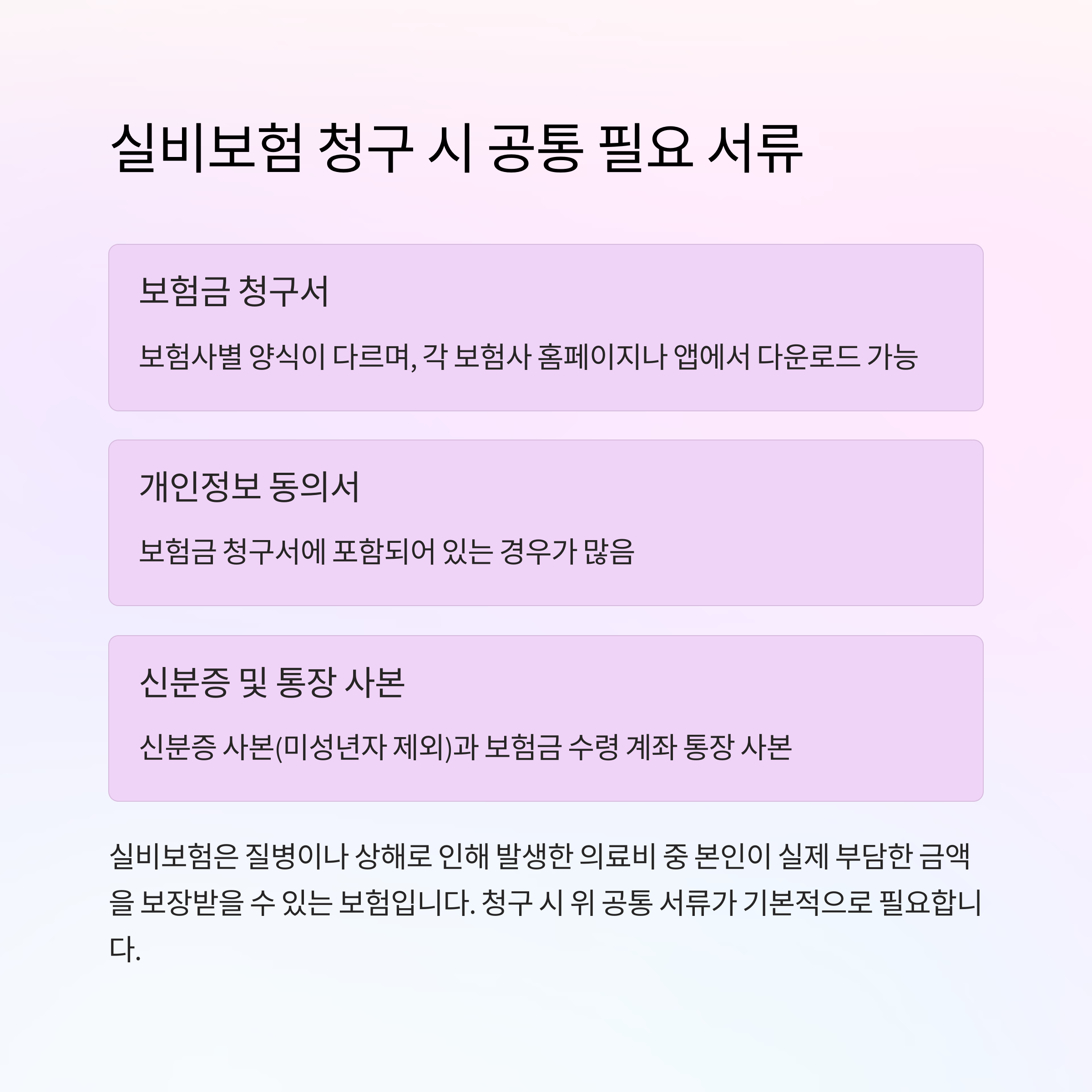 실비보험을 청구할 때, 어떤 경우에도 공통적으로 제출해야 하는 서류들이 있습니다. 아래 항목은 거의 모든 보험사에서 요구하는 필수 서류로, 미리 준비해두면 청구 과정이 훨씬 수월해져요.