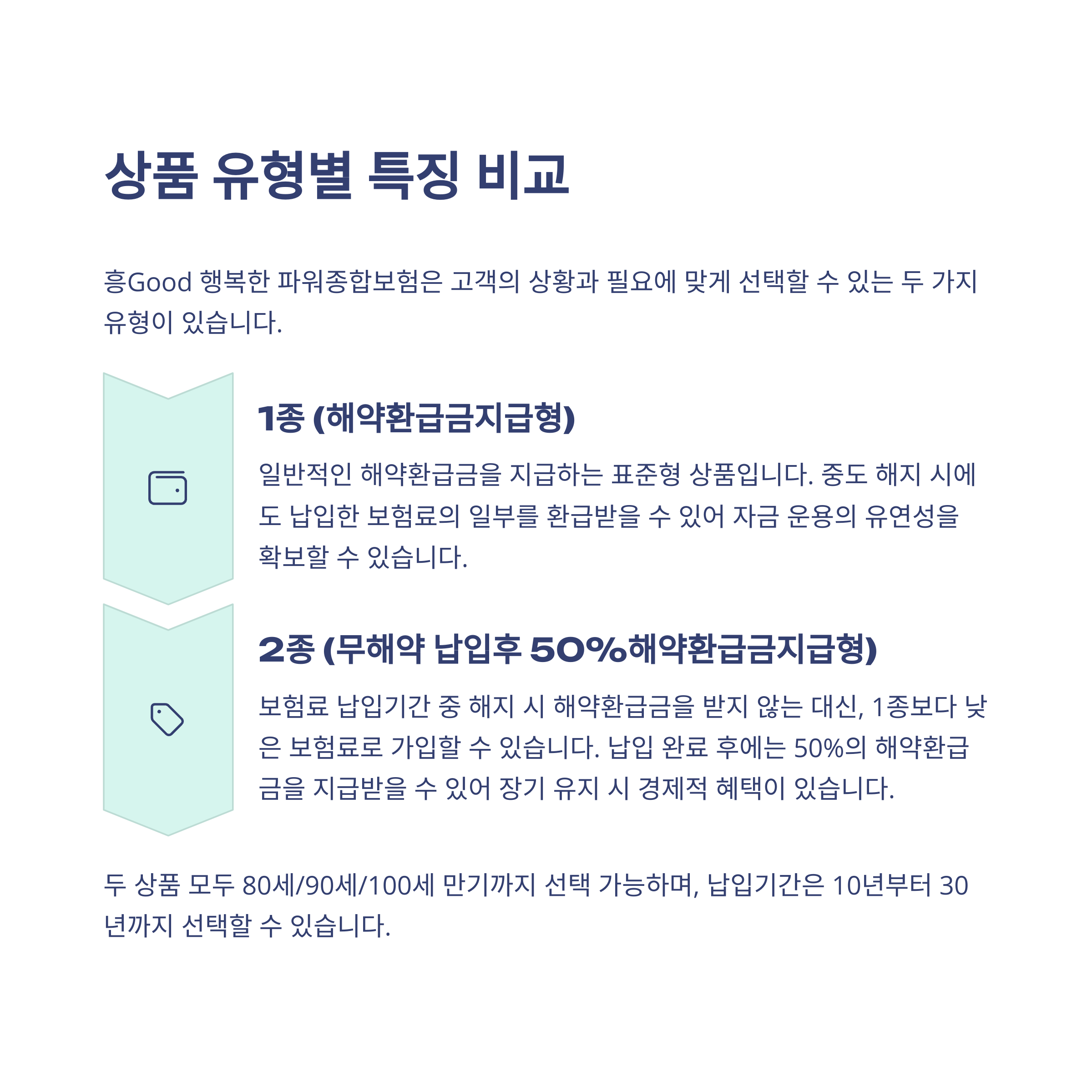 보험은 같은 이름이라도 유형에 따라 보장과 환급 조건이 완전히 달라집니다. 1종(해약환급금지급형)은 일반적인 환급형이고, 2종(무해약 납입후 50%환급형)은 조금 더 전략적인 설계가 가능해요. 비교해볼까요?