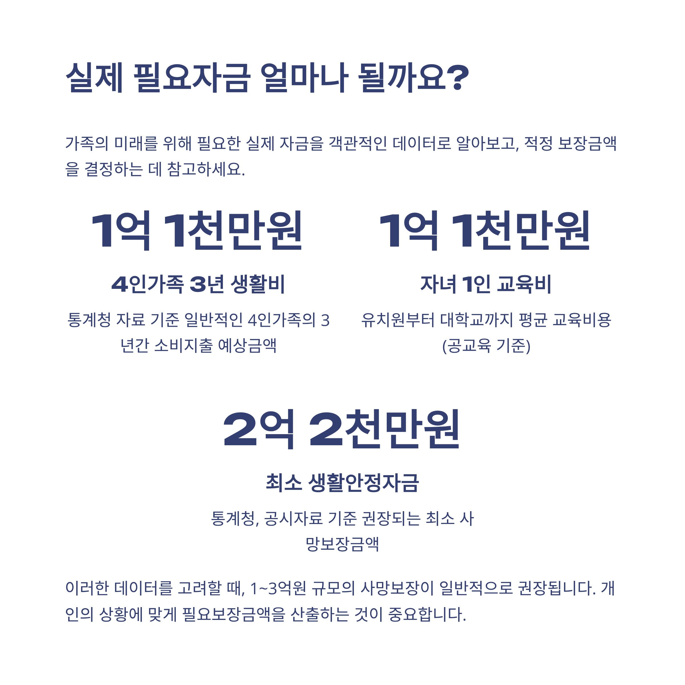즉, 사망보험금은 최소 2억 원에서 여유 있다면 3억 원까지 설정하는 게 안전한 선택입니다.