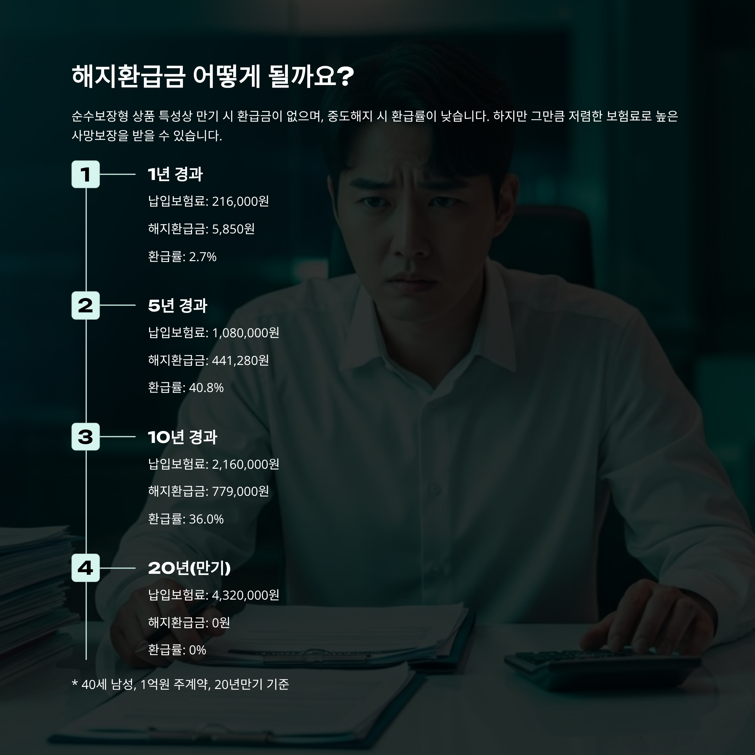 맞습니다. 순수보장형 구조라서 만기 시점까지 생존해도 환급금은 전혀 없습니다. 오직 사망보장에 집중된 상품이에요.