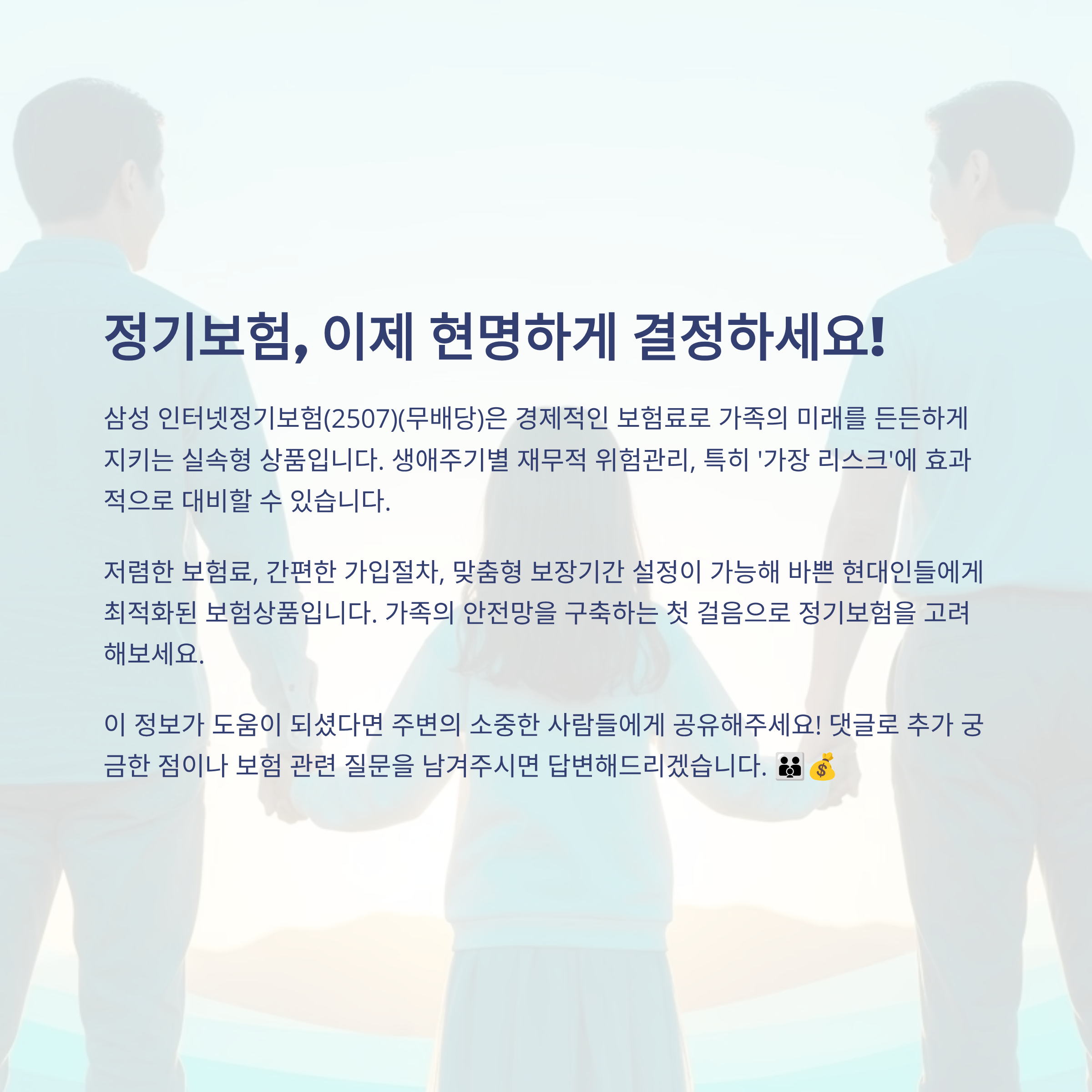 안녕하세요, 여러분 😊 저는 최근에 40대에 접어들며 ‘가족을 위한 사망 보장 보험’을 진지하게 고민하게 됐어요. 사실 말이 쉽지, 요즘은 종류도 많고 정보는 넘쳐나서 뭐가 진짜 필요한 건지 헷갈릴 때가 많잖아요? 그래서 제가 직접 꼼꼼히 살펴본 보험이 바로 삼성생명의 삼성 인터넷정기보험(2507)(무배당)이에요. 경제적으로도 부담이 적고, 보장 내용도 명확해서 저 같은 가장들에게 정말 딱 맞는 상품 같더라구요. 오늘 이 글에서는 그 실속 있는 이유를 아주 솔직하게 공유해볼게요!
