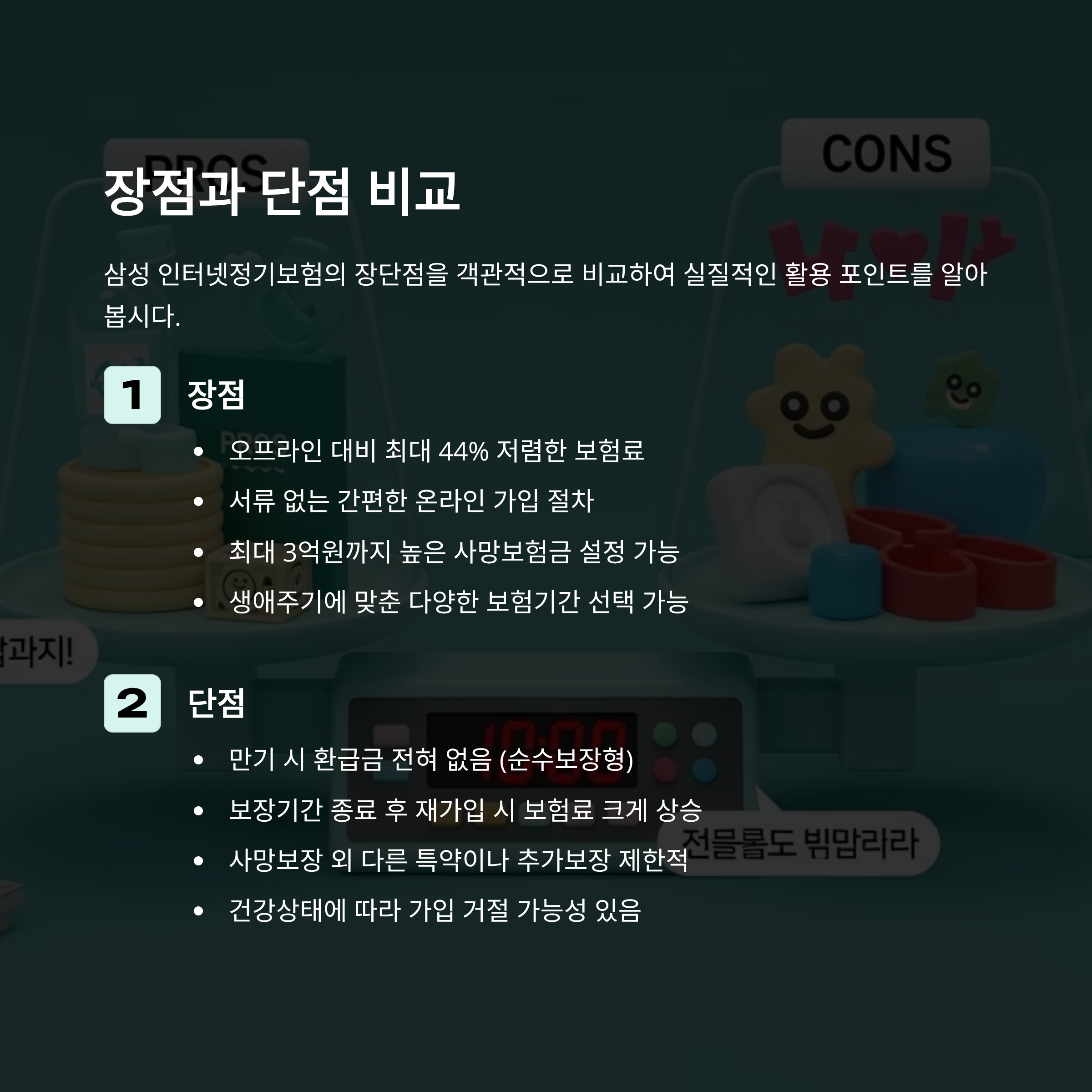 장점부터 볼게요. 첫째, 보험료가 정말 착해요. 오프라인 설계사 상품과 비교했을 때 최대 44%까지 저렴하니까요. 둘째, 서류 작성이나 대면 상담 없이 온라인으로 바로 가입 가능하다는 것도 큰 장점이죠. 셋째, 최대 3억 원까지 사망보장을 선택할 수 있어서 대출, 자녀 교육자금, 생활자금 보전에도 유리합니다.